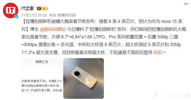 华为nova15或将搭载前后置双红枫华为nova15有望迎来全系大升级 如果爆料成真,nova 15这次升级可谓诚意十足。100W快充加持下,充电速度会有质的飞跃,而电池容量的提升则进一步保障了续航。影像方面,前后双红枫镜头值得关注,或许能带来更好的人像虚化、夜景纯净度和逆光表现,很期待真机的实际拍摄效果。