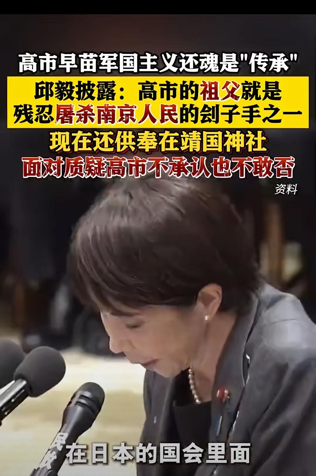 太颠覆认知了!邱毅老师一曝光,彻底看清高市早苗的真面目,她的军国主义嚣张根本不是装的,全是家族刻进骨子里的恶,祖辈满手中国人民的鲜血,简直令人发指!高市早苗祖父是侵华日军少佐,南京大屠杀时挥刀砍杀平民,踩着中国人尸体炫耀,还烧毁数千民房害百姓流离,外祖父也是同部队战犯,双手沾满罪恶,这样的战犯居然被供奉靖国神社,她还年年拜鬼,可想而知她的扭曲思想从哪来。更可怕的是她丈夫深耕军工,还帮台搞潜艇,家族从直接侵华变成干涉中国内政,本质就是没断过的侵略野心。军国主义的毒根不除,永远是隐患,历史的血债不能忘,更要警惕这类战犯后代的挑衅。你们觉得该怎么戳破日本右翼的虚伪面具?评论区聊聊!