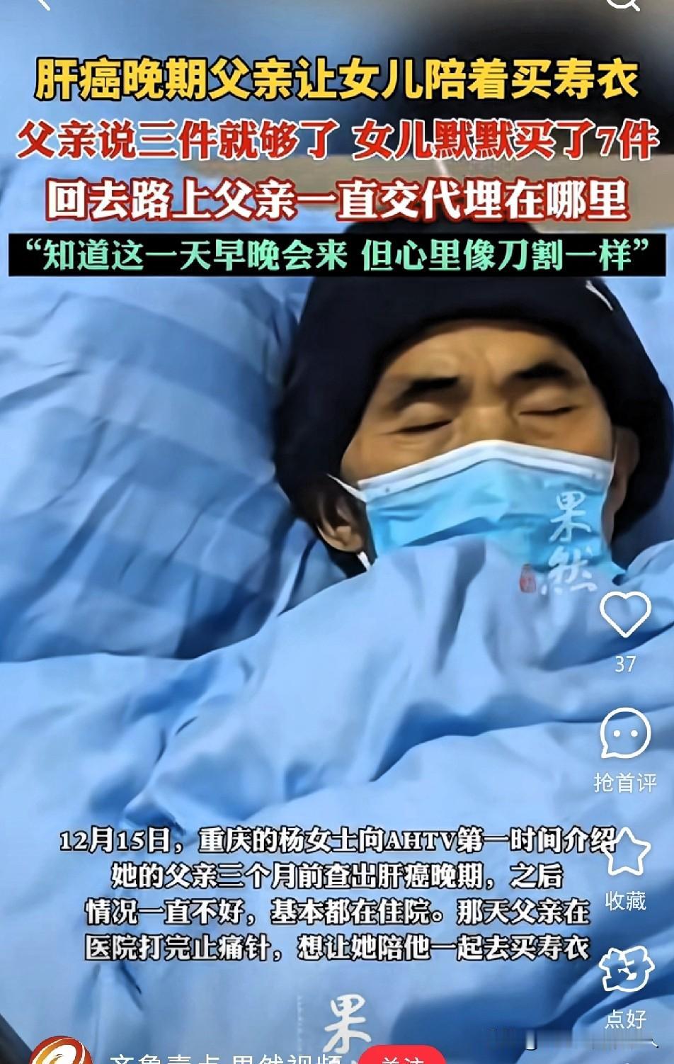 泪目! 重庆一父亲肝癌晚期,在医院打完止痛针后,突然提出,让女儿陪他出去买寿衣。 不料,到店里之后父亲说:“没必要买贵的,买3件就够了!”但是,女儿却默默买了7件,女儿坦言:“心像刀割一样痛,感觉爸爸这次可能要离开我了!” 跟在父亲后面,听着父亲一边挑选,一边说后事的话,女儿的心里很不舒服。 心里默默地想着,我这段时间一直在陪着父亲,知道他的生命在倒计时。 比起事后追悔,病床前的陪伴、认真听父亲说后事,才是对这份亲情最实在的珍惜。 提醒大家,不要等失去才懂得珍惜,与父母的时光要多陪伴,多沟通。 女儿买7件寿衣,藏着不愿接受父亲离去的执念,是想给父亲多一份“周全”,也是给自己留一点缓冲的念想。 你有没有哪一刻,突然读懂了父母藏在细节里的爱?评论区聊聊吧!