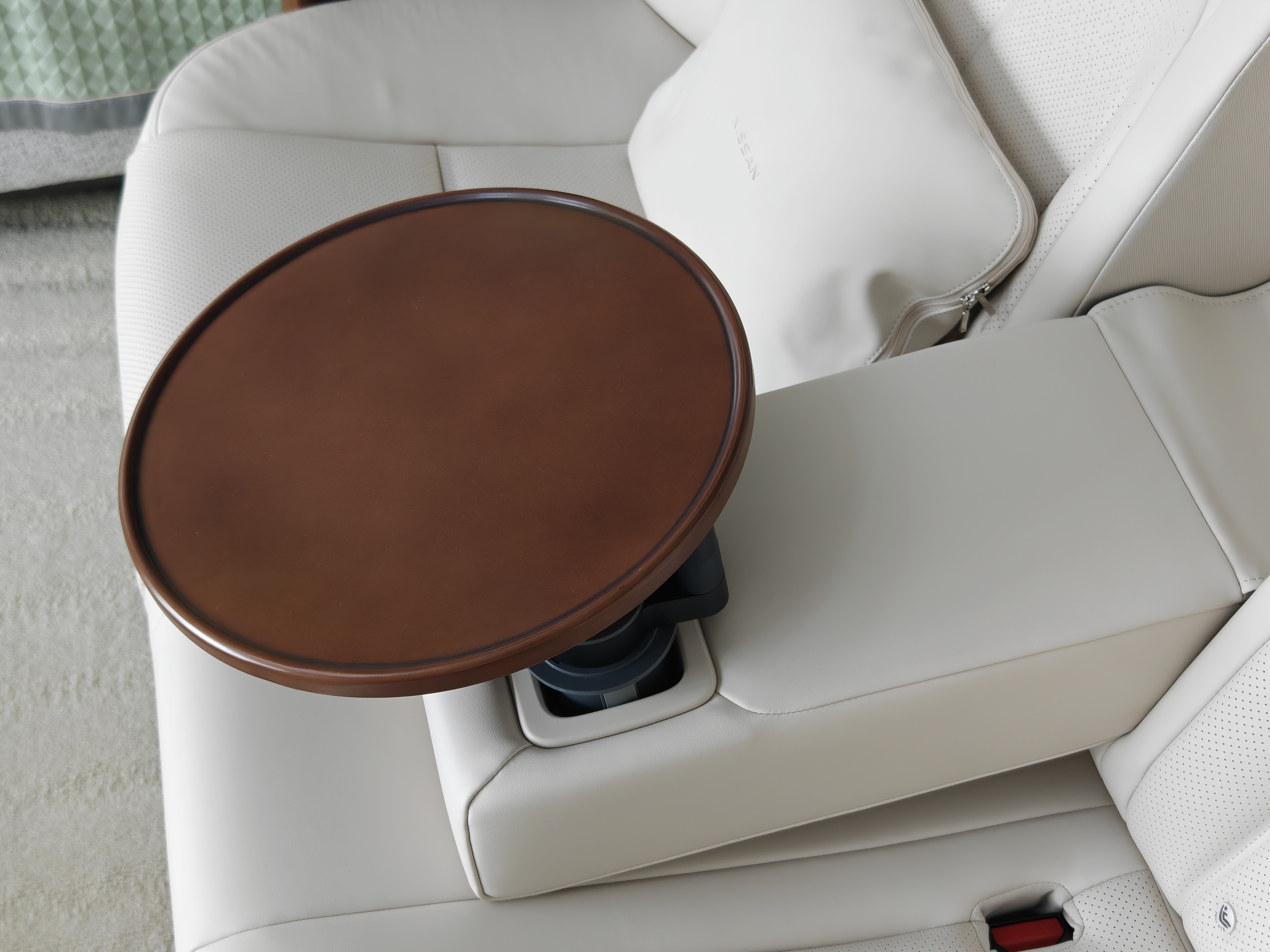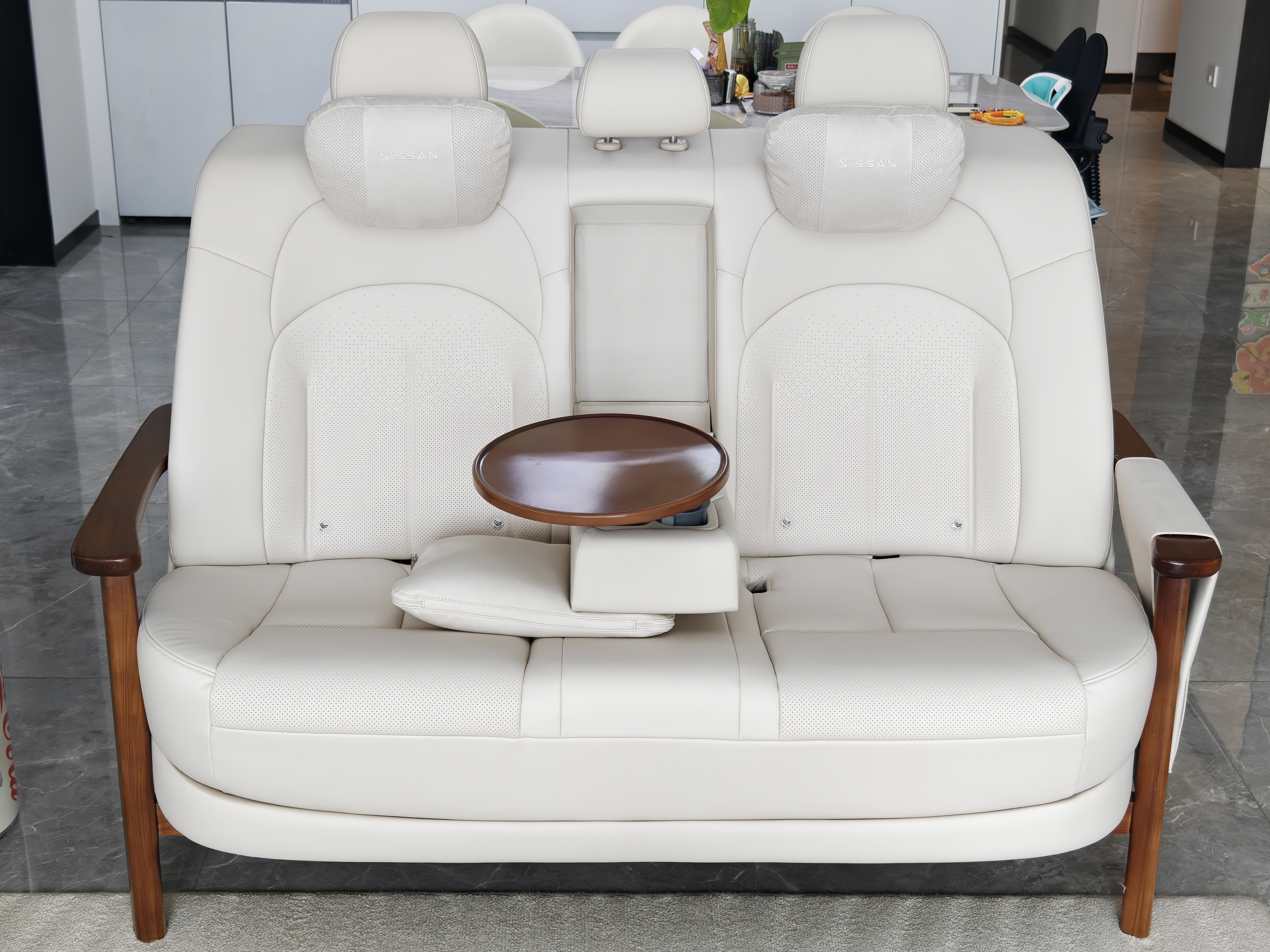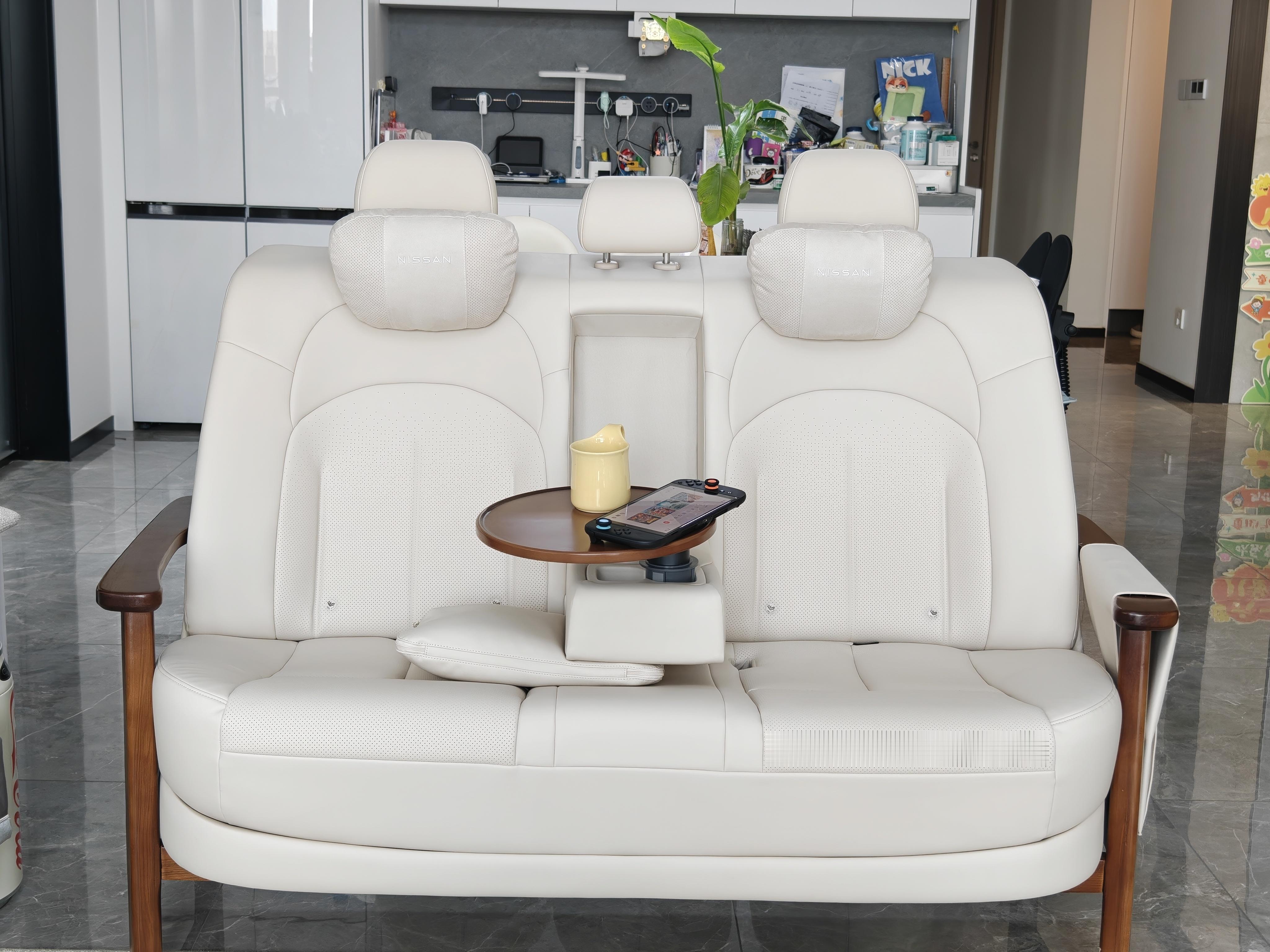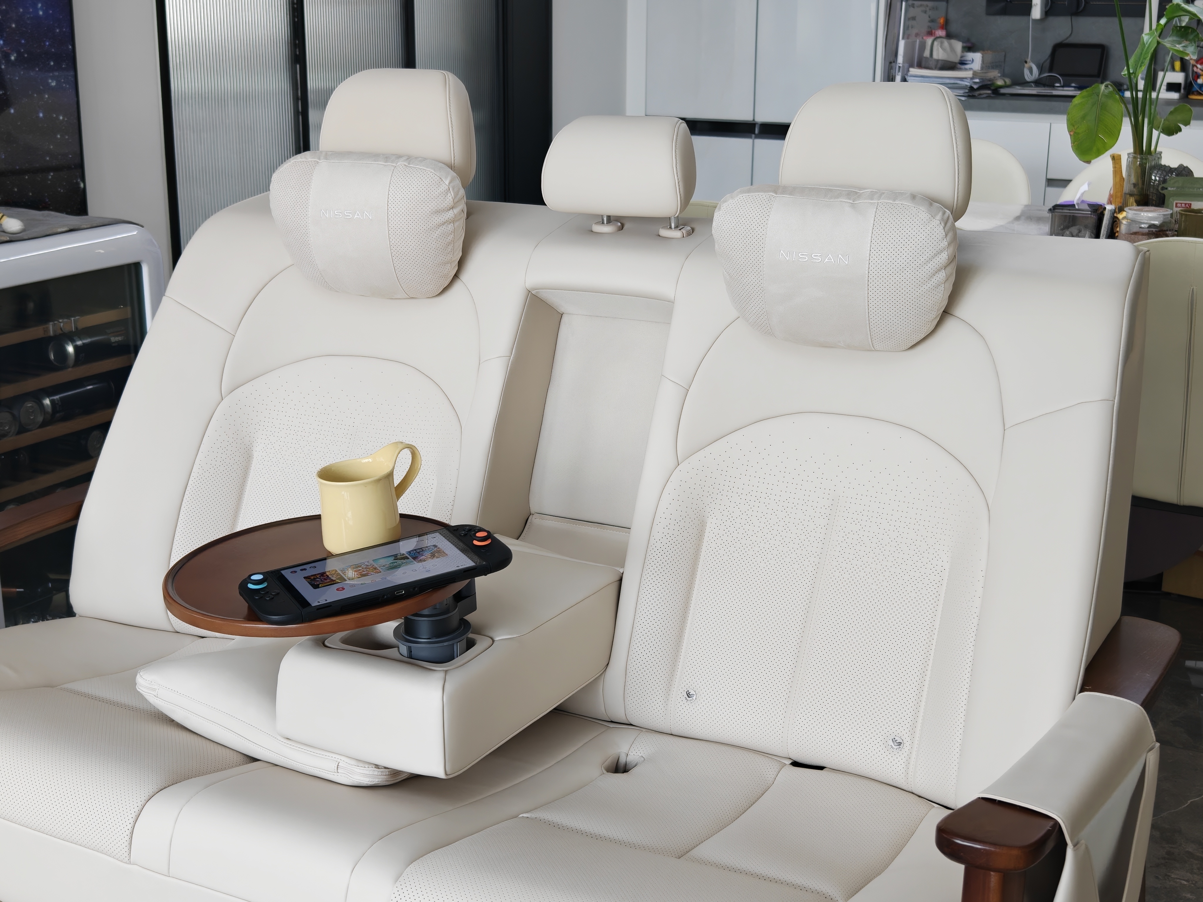 开箱百万级后排大沙发 东风日产N6上的后排沙发我差不多持续使用半月。最大的体验还是乘坐舒适性表现非常出色,这主要归功于座椅内部三层海绵结构的设计:1、58mm的高密度发泡海绵,提供坚实可靠的承托力,确保久坐是也会有承托感;2、中层则是20mm的类似记忆海绵一样的材质,用于恰到好处的回弹力,坐下去的时候有一种凹陷感;3、表层是10mm空气海绵,有效增强了座椅的通风透气性能,避免了传统真皮座椅在长时间使用后容易产生的闷热不适感。座椅靠背的贴服性也不错,只是在实际使用过程中,我发现腰部位置存在轻微的悬空感。好在这一问题可以通过添加一个适配的靠垫得到解决,进而为老年人获得更好的腰部支撑效果。另外就是还有一些旋转小桌板、侧边置物袋的设计,整体细节都做得很好。就是中央扶手放下来需要垫一下,要不然桌板会倾斜。个人认为,与家中那些宽大且靠垫相对靠后的传统沙发相比,这款座椅的人体工学设计显然更为出色。毕竟它就是一个车载座椅,在大腿承托长度与靠背倾斜角度的匹配度上更符合日常乘坐,可以带来更为舒适自然的乘坐体验。汽场全开大v聊车