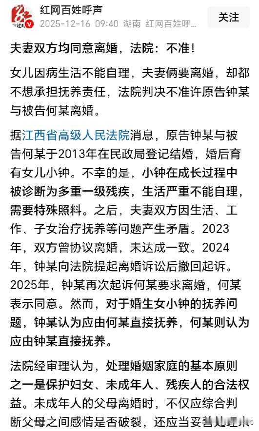 江西,钟某与何某婚后育有女儿小钟,原本幸福的三口之家,却因小钟三岁被确诊多重一级残疾,生活陷入困境,夫妻俩为给孩子治病积蓄耗尽,矛盾渐生,感情破裂欲离婚,协议离婚因抚养权谈崩,,钟某起诉又撤诉,,再次起诉后,法庭上两人都同意离婚,却都不想抚养孩子,法院对这桩家务事最终这样判。 (来源:红网百姓呼声) 钟某和何某结婚后,很快迎来了可爱的女儿小钟,一家三口的小日子,满是温馨和甜蜜。 可小钟三岁那年,被查出多重一级残疾,生活完全无法自理,这瞬间击垮了这个原本幸福的家庭。 为了给小钟治病,钟某和何某四处奔波,家里的积蓄像流水一样花出去,很快就见了底。 经济上的压力,让夫妻俩的矛盾逐渐凸显出来。 钟某开始抱怨何某,说何某为了照顾孩子辞职,没了收入,让家里的经济状况更糟糕。 何某也不甘示弱,指责钟某每天只顾着工作,根本不帮忙照顾孩子,所有的重担都压在她一个人身上。 两人你一言我一语,争吵越来越频繁,感情也在一次次的争吵中逐渐消磨殆尽,他们都觉得这日子没法再过下去了,离婚的念头在他们心中越来越强烈。 2023年,钟某和何某决定协议离婚,可当谈到孩子的抚养权时,两人却产生了分歧。 谁都不想承担抚养小钟的责任,都觉得这是个沉重的负担,最后,因为抚养权谈崩,协议离婚的事就这么黄了。 2024年,钟某一气之下,提起了离婚诉讼。 可到了法庭上,看着可怜的小钟,他又有些心软了,再加上何某在法庭上哭诉,说希望为了孩子再给彼此一个机会,钟某犹豫了,最后撤回了诉讼。 然而,日子并没有因为这次撤诉而变好,夫妻俩之间的矛盾依旧存在,争吵还是不断。 2025年,钟某再次提起了离婚诉讼。 这一次,在法庭上,钟某和何某都明确表示同意离婚,可当问到孩子的抚养问题时,两人却都低下了头,谁都不想抚养小钟。 他们把小钟当成了一个烫手山芋,都想把这个责任推给对方,谁都不愿意接手。 父母对残疾子女的抚养义务,能否因离婚而免除? 钟某和何某都觉得,既然要离婚了,那抚养孩子的责任就不该再由自己承担。 可从法律上来说,父母对未成年子女的抚养是法定义务,这是不能推卸的。不管两人是否离婚,都得承担起抚养孩子的责任。 要是父母实在没有能力抚养呢? 就算父母经济困难,也不能完全免除抚养义务,可以通过其他方式,来保障孩子的生活。 在这种情况下,会如何判决离婚诉求? 钟某和何某都同意离婚,可都不想抚养孩子,他们觉得法院应该会判离婚,然后把孩子判给对方。 但法院在处理离婚案件时,要按照最有利于未成年子女的原则来处理。 像钟某和何某这种情况,拒绝抚养孩子,违背了公序良俗。 所以,不会轻易判决离婚,而是会先保障孩子的权益。 就像有人问,要是一直不判离婚,他们岂不是要一直这么拖着? 这么做,是为了督促父母承担起责任,等父母妥善安排好孩子的抚养问题后,才会考虑离婚判决。 如果父母拒绝抚养孩子,会面临什么法律后果? 钟某和何某现在都不想抚养孩子,这种行为已经违反了法律规定。如果他们继续拒绝抚养,可能会面临法律的制裁。 情节严重的,可能会构成遗弃罪,要承担刑事责任。 有人就好奇,那要是他们只是口头拒绝,没有实际行动呢? 就算只是口头拒绝,也是一种不履行抚养义务的表现,可以对其进行批评教育,强制要求他们履行抚养责任。 最终,法院驳回了钟某和何某的离婚诉求。 钟某和何某只能默默接受这个结果,他们知道,自己必须承担起为人父母的责任。 看着孩子无辜的眼神,他们心里也有些愧疚,决定以后好好照顾孩子,给孩子一个温暖的家。 孩子是最无辜的,她本来就已经承受了残疾带来的痛苦,还要面对父母因为逃避责任而闹离婚。 父母的爱是孩子最大的依靠,不管遇到什么困难,都不应该抛弃自己的孩子。 在面对残疾孩子时,父母选择离婚并且都不想抚养,这种做法你能理解吗? 孩子是父母爱情的结晶,无论孩子健康与否,父母都有责任和义务去照顾他们。 残疾孩子更需要父母的关爱和陪伴,这时候父母选择逃避,实在是太不负责任了。 孩子是无辜的,无论遇到什么困难,父母都应该成为他们最坚强的后盾。 希望钟某和何某能真正明白这个道理,给小钟一个温暖的家。 您对这件事有什么看法呢?