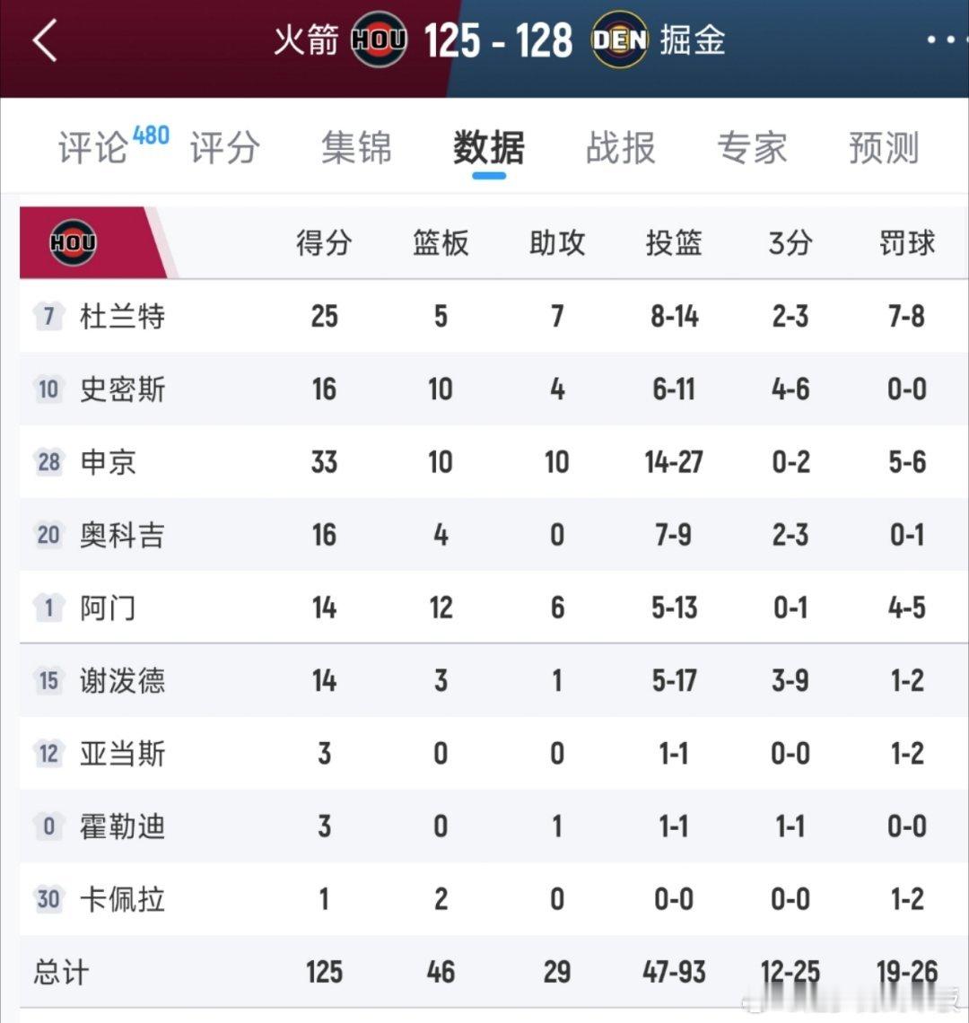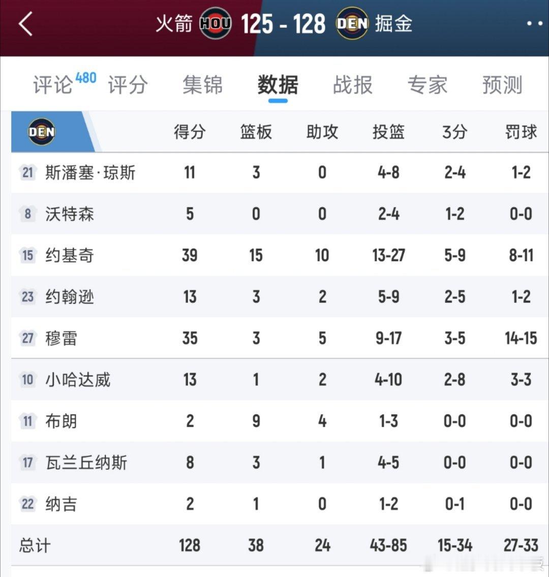 申京绝平三分不进!掘金主场加时128-125战胜火箭,赛季双杀对手!掘金维持西部第2,约基奇39分15板10助,穆雷35分;火箭降至西部第5,申京33分10板10助,杜兰特25分。湖人、马刺排名各上升1位,排名西部第3、4火箭vs掘金