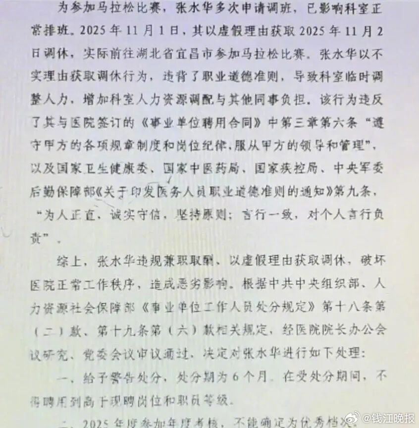 #浙江宣传谈白岩松评张水华事件#【张水华式难题怎么解】#浙江宣传探讨张水华式难题怎么解# 最近几天,“最快女护士”张水华再次成为网络热议的焦点。一份医院的内部处理决定,让这位曾在马拉松赛道上闪耀的冠军,陷入了比长跑更为漫长的舆论漩涡。从哈尔滨马拉松比赛夺冠后含泪“喊话”领导支持调休,到公开道歉承诺分清工作与爱好,再到医院“警告处分、取消评优”的通报和最近福州马拉松比赛的缺席,张水华的经历,掀起了一场关于梦想、规则与公平的全民讨论。一回顾张水华事件,会发现有几个问题是大家讨论最为热烈的。比如,调休跑马拉松,单位是否应该支持?今年8月底,作为福建医科大学附属第一医院护士的张水华,在哈尔滨马拉松比赛上,以2小时35分27秒的成绩夺得国内女子组冠军。冲过终点后,她面对镜头哭诉,希望领导能够支持自己周末调休跑马拉松,迅速成为网络焦点。随着舆论发酵,张水华在社交媒体公开道歉,承诺会将工作与爱好分得更清。然而争议并未停止。有网友认为,张水华依靠自身努力与天赋取得优异成绩、获得合法奖金值得肯定。在倡导多元发展的今天,职场人应当有追求业余爱好、实现自我价值的空间。也有网友认为,张水华自己去跑马拉松,反而让同事替她上班,这本身就不公平。一番吐槽的言论,也让单位遭受巨大压力。比如,自己拥抱爱好,成本该由谁来承担?在哈尔滨马拉松比赛之后,张水华又接连参加多场马拉松比赛。有媒体统计,10月19日以来,她参加了5场马拉松,获得超20万元奖金。有许多网友提出质疑,在工作繁忙、人手紧张的三甲医院,张水华的这些行为很可能存在将个人追梦的成本转嫁给同事的问题。张水华既享受体制内的稳定保障,也享受着“最快女护士”这一光环带来的荣耀,却绕过规则追求个人梦想和收益,而让单位和同事承担额外负担。比如,单位是否应该偏袒有特殊才能的员工?12月9日,有网友公开的一份医院内部处理决定称,张水华因违规兼职取酬、以虚假理由获取调休,被处以警告处分6个月,并取消2025年度评优资格。12月10日,该医院官网发布情况说明,重申“在遵纪守法、不影响本职工作的前提下,鼓励员工发展个人兴趣爱好”。此后,张水华清空了社交账号的作品,并放弃了福州马拉松赛事。这再次在网上引起热烈讨论。白岩松在央视《新闻周刊》节目中提出,如果我是医院的院长,在处分之前或之后积极沟通,让她减少当护士的时间,而去医院的工会,在我们的医院正在由治疗中心向健康中心转型的过程中,让张水华成立面向公众的跑团,带动本院的医生、护士参与跑步,更重要的是带动整个福州的市民更多参加跑步……这一番言论体现了白岩松的包容和善意,却也把张水华事件的热度推向了新高。针对该观点,有网友说,按此推理,是否人有出色才艺,无论什么岗位,都可以去工会?何况,工会的基本职责是维护职工合法权益、竭诚服务职工,一般来说,工会的岗位也比较少,不能为个别职工的“特殊才能”开辟绿色通道。二大家对张水华事件的讨论,体现出对职场公平、职场管理的高度关切。有人说,在赛场上,谁跑得快,谁就是冠军,但在职场中,公平才是王道。在张水华明确的违规事实面前,如果我们过度强调“机制灵活性”,可能模糊是非边界,回避了个人应优先履行岗位基本职责这一核心前提。在笔者看来,各司其职、不影响单位和他人是基本的职业道德,脱离了行业准则约束,所谓“市民的护士”便无从谈起。更何况,张水华所处的还是“性命攸关”的医疗行业,救死扶伤是本职工作,若兼职影响了本职,既是对本单位同事的不公平,也是对医院患者的不公平。但张水华确实有着独特才能。今年全运会女子马拉松赛第一名的成绩是2小时30分20秒,而张水华在常州马拉松上的成绩是2小时30分38秒。她用自己的不懈努力,既为个人挣得了荣誉,也为单位赢得了声名。其实,在许多单位,都存在像张水华这样平时并不显山露水,却在其他专业领域展现出独特才能的人。这类人在常规岗位上可能表现并不十分突出,但一旦投身热爱的领域,便能绽放异彩。如今,随着社会发展日益多元化,对有特殊才能的员工该如何管理,已经成为一道比较普遍的难题。对这类员工的评价与认定,单位确实会面临两难的困境。尤其在业务导向鲜明的事业单位和企业中,这类人才提出调休、调岗等个性化需求时,往往需要同事协作配合,无形中增加了管理难度。若过度推崇,可能对忠于职守、默默奉献的员工造成不公,引发员工不满;若视而不见甚至刻意压制,则既违背人才发展规律,也可能造成人才资源的浪费。这种矛盾,导致部分有特殊才能的员工被管理层视为“麻烦”,进而遭遇隐性打压。当然,也有不少单位和企业做出了更有智慧的选择:在完成本职工作的前提下给予充分发挥才能的空间,让这些掌握特殊才能的员工与现实工作需求尽可能实现双向奔赴。总体来看,有特殊才能的员工的成长不能是一场“独角戏”。组织固然需要给予培育支持,但员工自身也需把握分寸。若将自身特长异化为特权,要求组织或同事无条件让步配合,甚至利用网络舆论倒逼单位给自己“开绿灯”,这种精致利己主义的认知和行为不仅会破坏职场氛围,为个人发展制造障碍,也更容易产生不少本可避免的职场矛盾。三张水华事件引发热议,也牵出一个值得