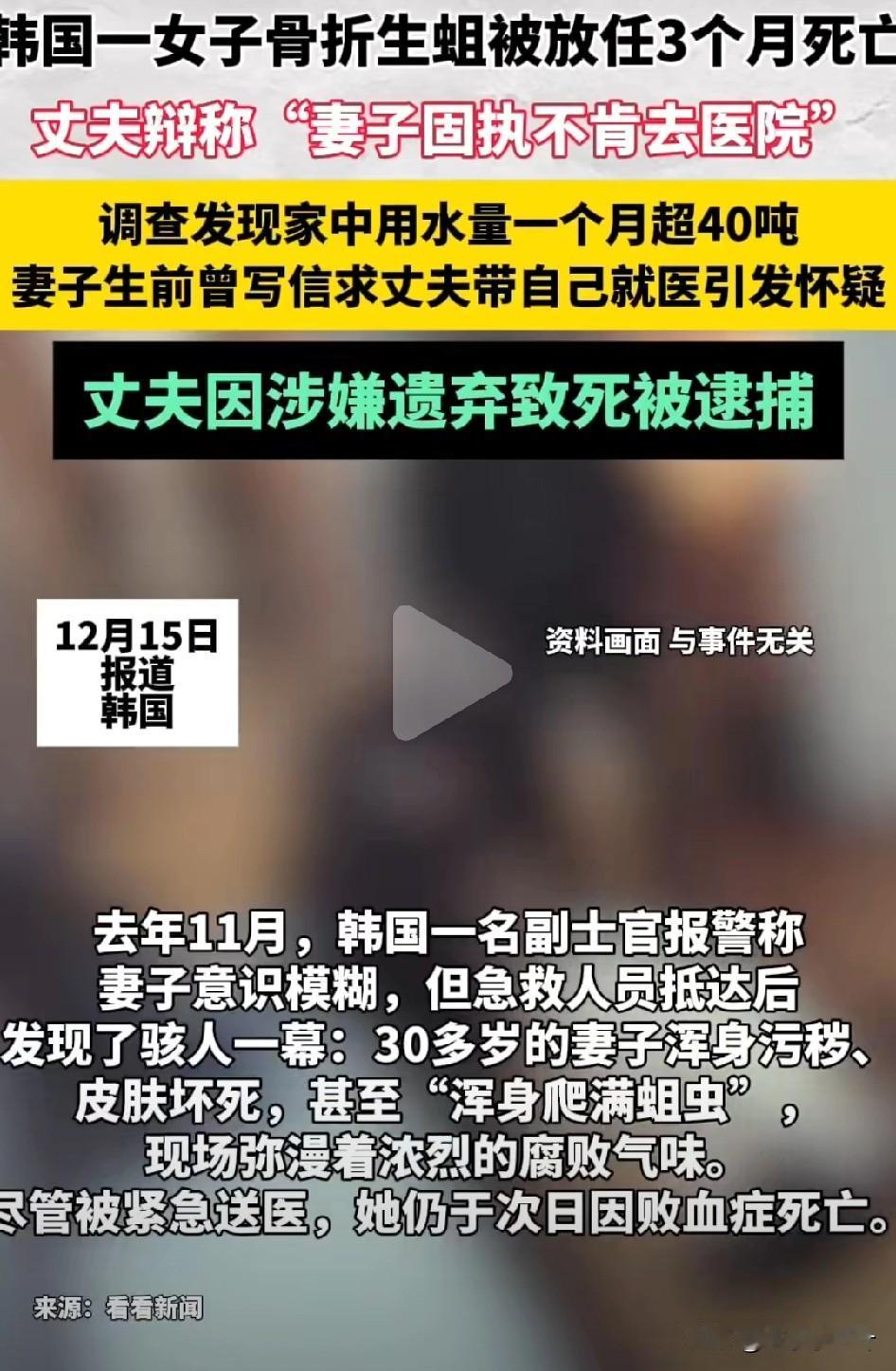 我突然想到了那句话“我的女儿嫁给你,如果有一天你不喜欢她了,不要伤害她,把她给我送回来,我不怪你”[流泪] 想想也很可怕,以前女人没地位,指望嫁人被善待,不被善待要“还”回来,没有主体性的存在……唉😔韩国女子骨折生蛆死亡丈夫称不知情