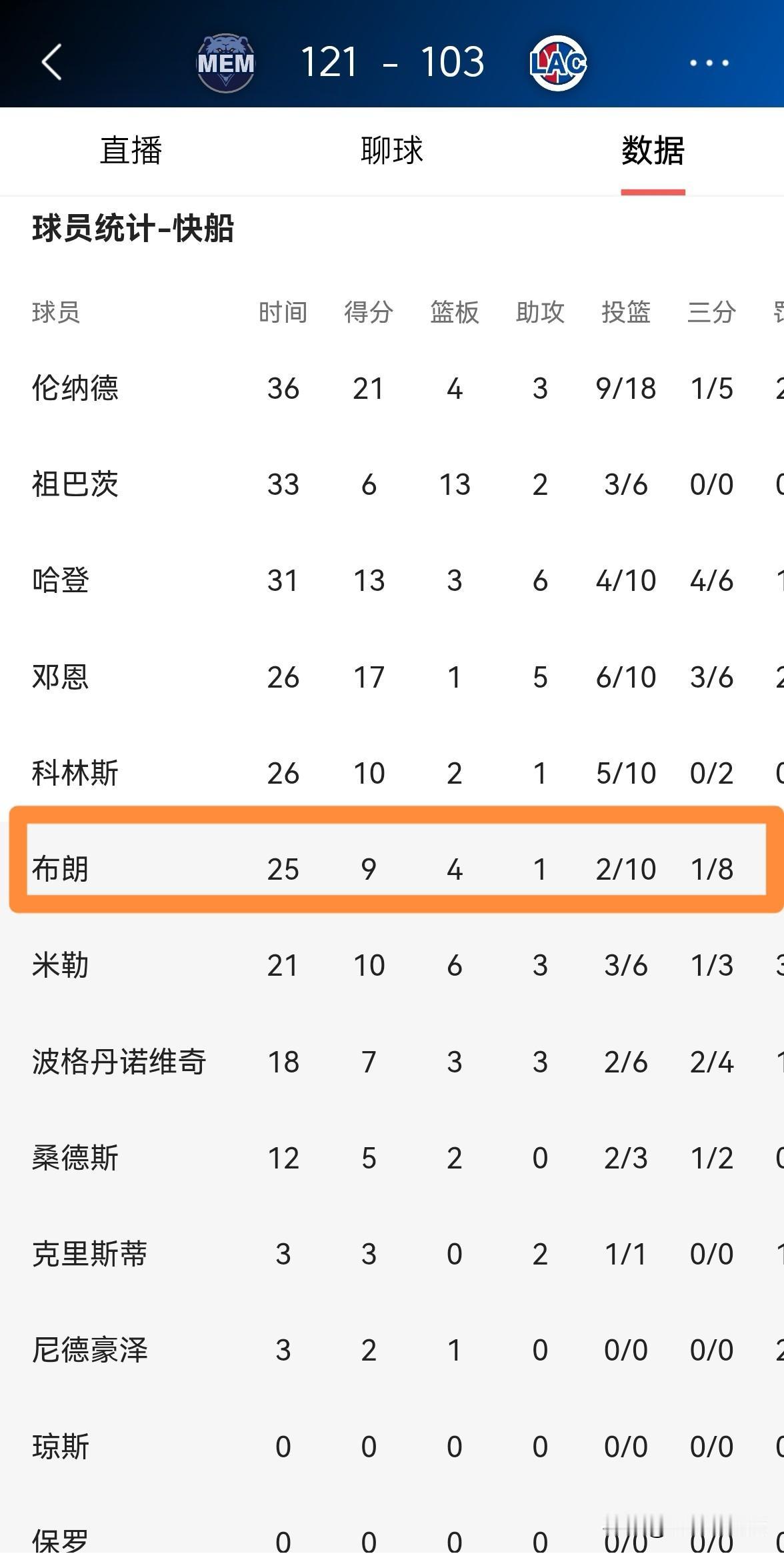 我强烈建议快船主帅泰伦-卢弃用科比-布朗!在今天快船主场以103:121惨败于灰熊的比赛中,布朗的表现简直是糟糕至极。 整场比赛下来,布朗替补出战25分钟,投篮10中2,其中三分球8中1极其低效的得到9分,他的场上正负值为球队最低的-27。 毫不客气的说,如果泰伦-卢在接下来的比赛中坚持使用布朗,那么快船还会继续输球。