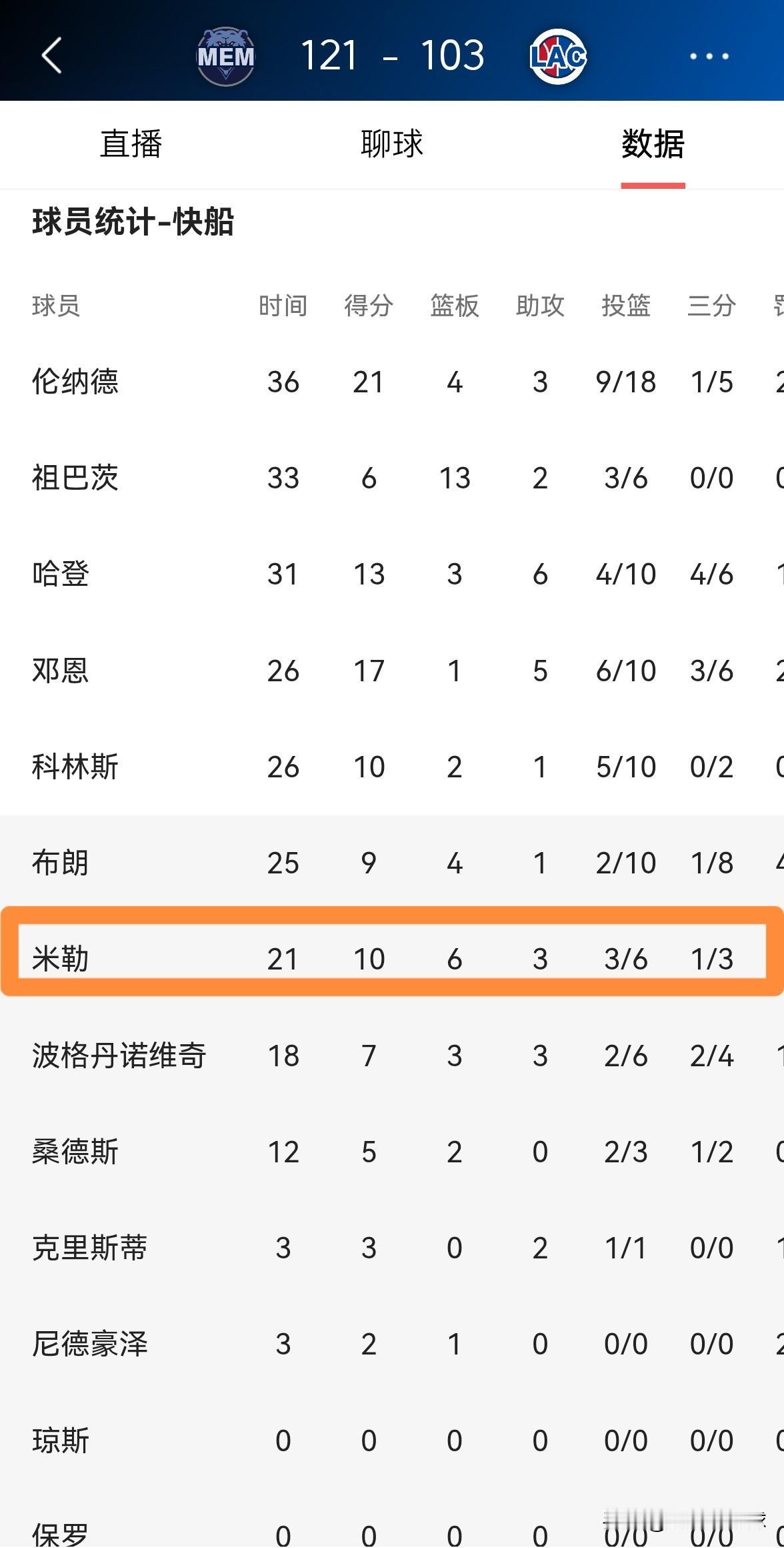 快船小将乔丹-米勒绝对值得重用!尽管今天快船在主场以103:121输给了灰熊,但是米勒的表现却可圈可点,他在替补出战的21分钟里,投篮6中3,其中三分球3中1、罚球4中3得到10分6篮板3助攻。 对于目前的快船来说,米勒绝对值得球队重用,虽然米勒的比赛经验比较缺乏,但是他在场上能够为球队提供急需的能量。