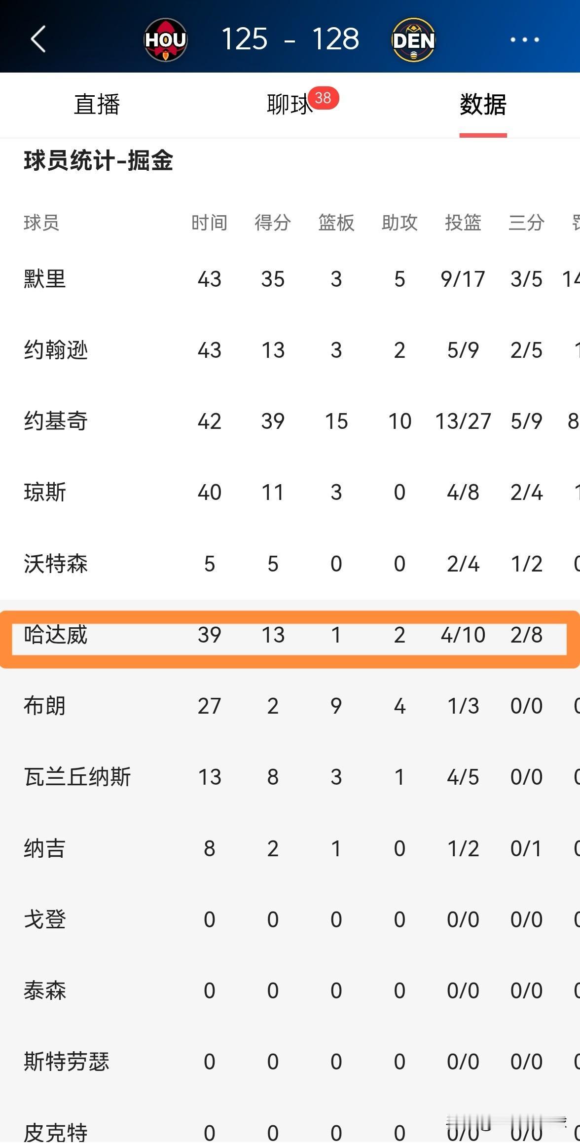 掘金大将哈达威真是深受重用!在今天掘金主场以128:125击败火箭的比赛中,哈达威获得了多达39分钟的出场时间,投篮10中4,其中三分球8中2、罚球3中3得到13分2助攻2抢断,他的场上正负值为+4。 作为一名替补球员,哈达威能够得到如此多的上场时间,足以证明球队对他的重视。