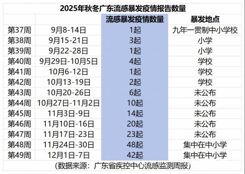 【#广东流感阳性率已超53%#,但暴发疫情数量比上周减少】12月15日,广东省疾控中心发布第49周流感监测周报,数据显示,广东省流感监测哨点医院的流感样病例占门急诊病例总数百分比(13.35%)、门急诊流感样病例标本流感病毒阳性检出率为(53.97%)继续创今年新高,不过,该周报告的流感暴发疫情数量(42起)比上一周(48起)有所减少。2025年秋冬,广东的流感暴发疫情从9月起开始有报告,10月底之后超过10起,至11月底增加至48起,12月第一周略有减少。广东省疾控中心传染病预防控制所所长、传染病防控首席专家康敏指出,广东省自37周进入流感流行季,目前处于高流行水平。预计近期仍将波动上升,根据既往流行规律,可能在12月中旬前后达到流行高峰。康敏建议广大市民保持勤洗手、讲卫生的好习惯,注意居室通风,减少前往人群密集或通风不佳的公共场所,如需前往建议佩戴口罩。