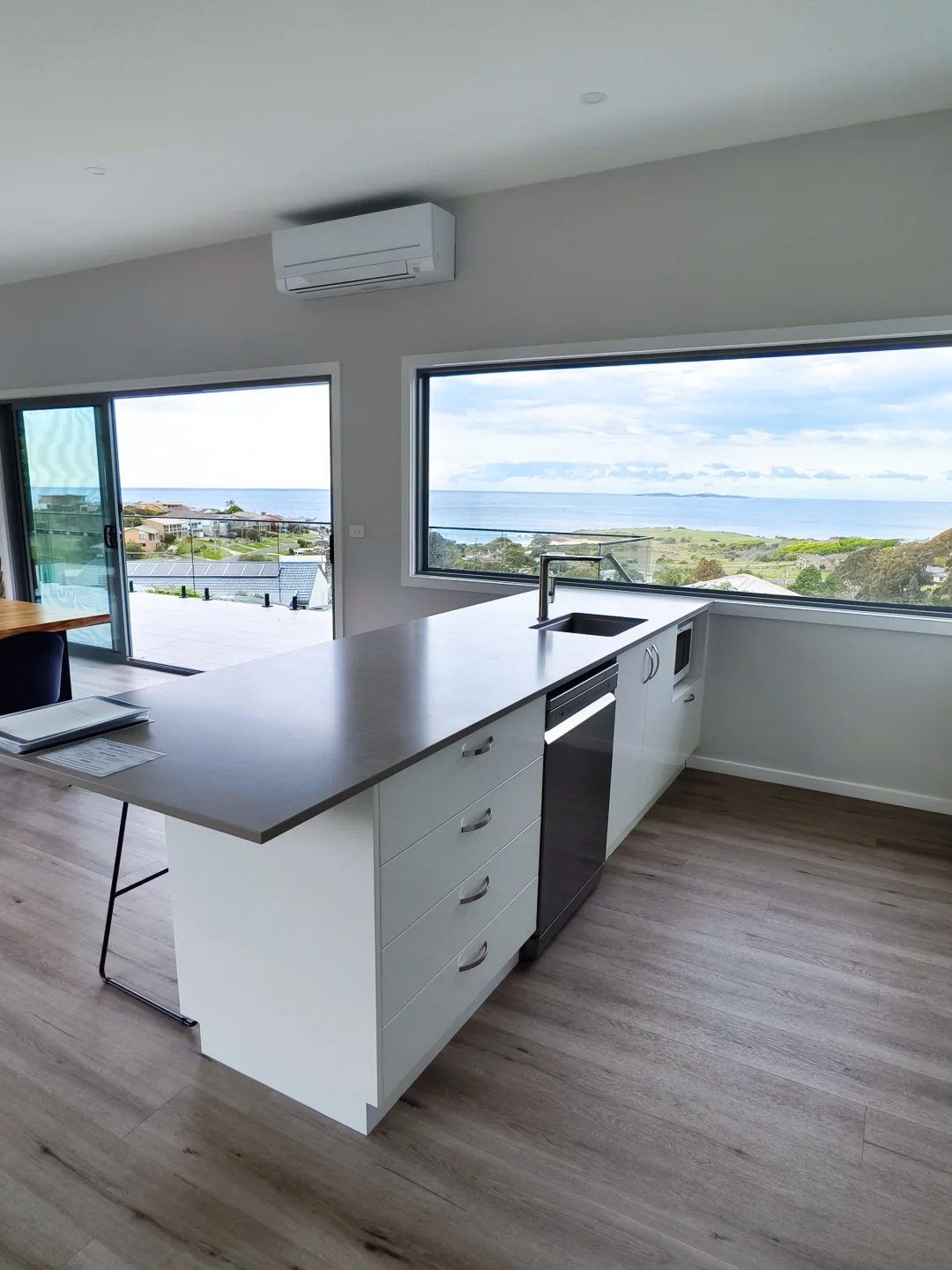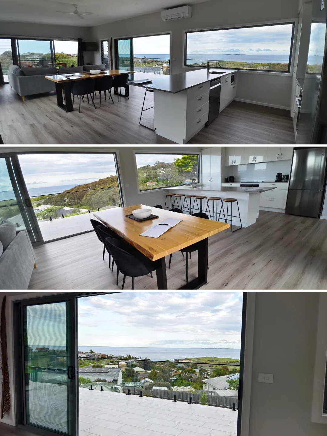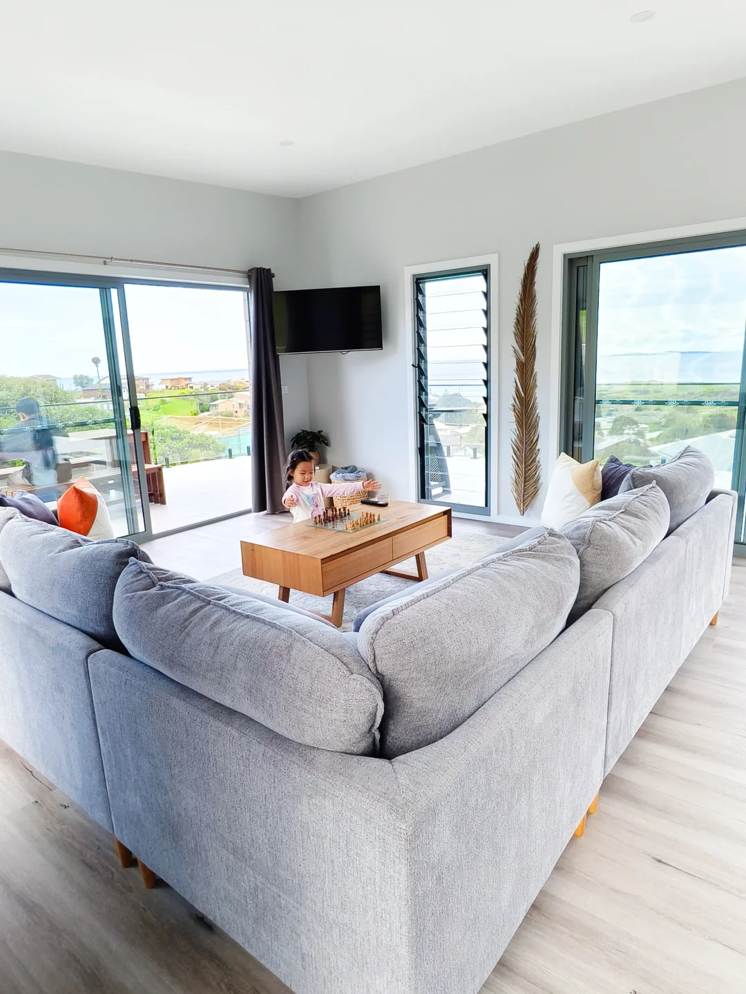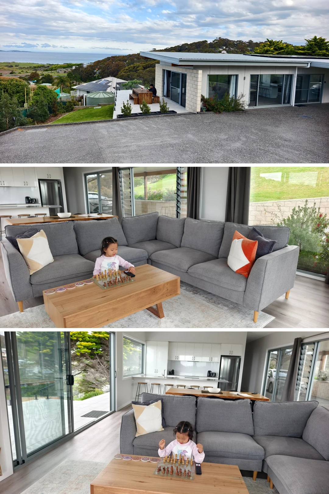 从客厅推开玻璃门,步入一个宽敞的木质看台。低头是修剪整齐的草坪,抬头就是观赏海岸线的黄金席位。住在这里的三天两晚,最爱做的事就是泡一杯茶坐半天,看着远方的礁石和海浪