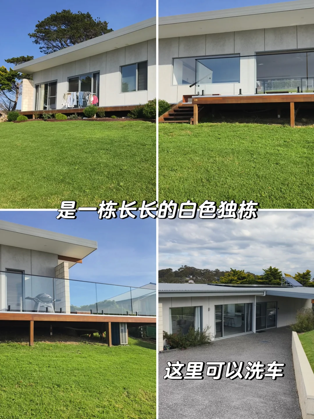 🏡外观是一栋纯粹的独立平层别墅,洁白的墙体在阳光下透着一种开阔安稳的气场。门口是一片修剪整齐的巨大草坪,像一块柔软的绿毯,远方则是海与蓝天的无缝衔接