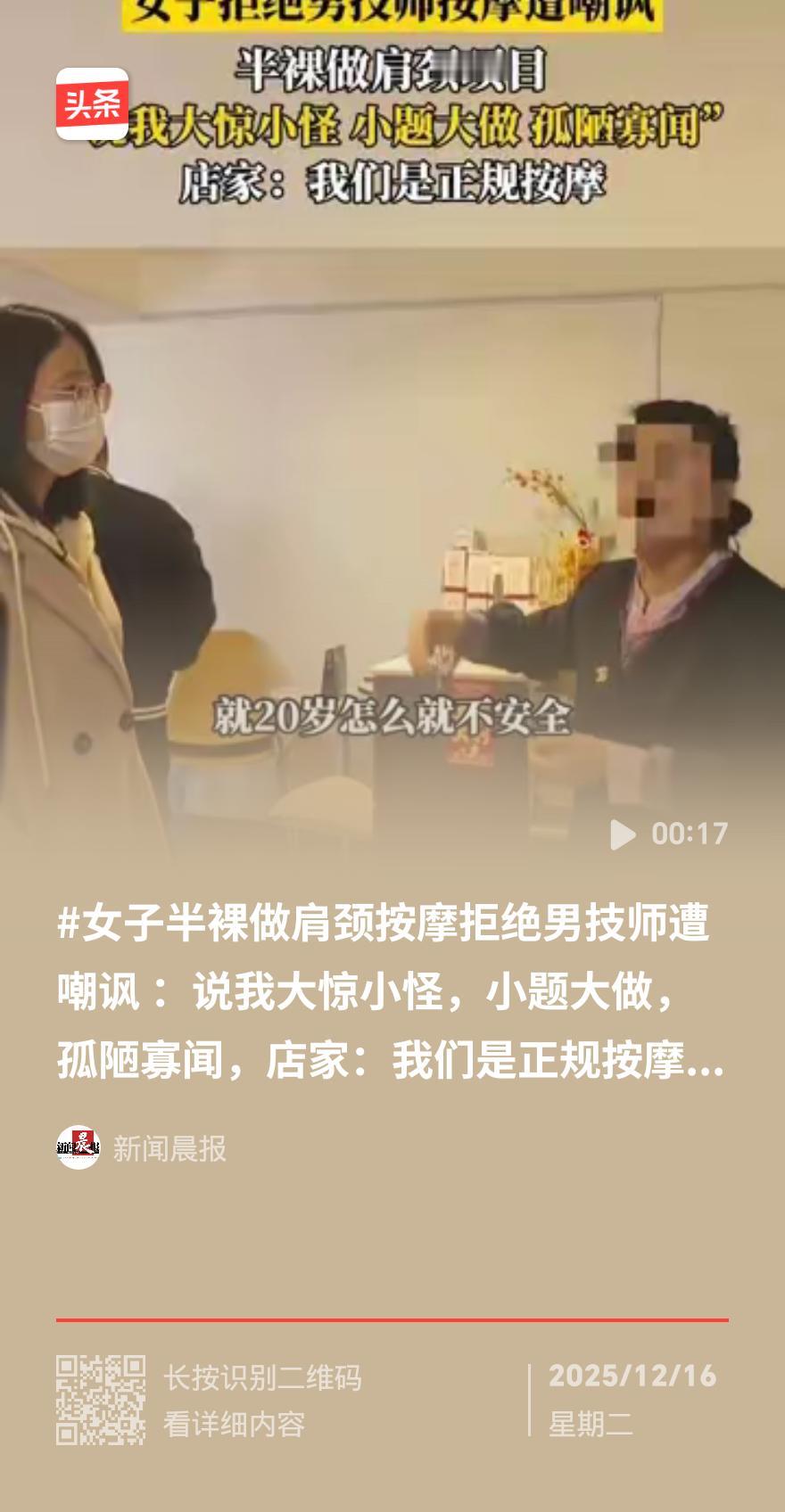 脱衣做肩颈遇男技师 女子拒绝反遭嘲讽 店家回应引争议 长沙黄女士的一次肩颈SPA体验,闹得一肚子火。她作为YSM于诗曼·科技抗衰美肤中心(德思勤店)会员,12月12日到店做护理,脱上衣趴床后,竟被安排了男技师。 黄女士当场明确拒绝,老板娘却不以为然,还嘲讽她孤陋寡闻、大惊小怪,甚至拿医院男医生、足浴店男技师举例,调侃男技师才20来岁,年纪能当她儿子,肯定看不上她。这番话气得黄女士当场落泪,急忙联系丈夫胡先生。 胡先生赶到门店要求老板娘认错,对方却坚称在老家这是常态,还强调全程在场、黄女士盖着毛巾,不存在安全问题。记者陪同黄女士夫妇上门核实,店长先是狡辩黄女士没明确拒绝男技师,后又矢口否认嘲讽言论。 经店内其他工作人员劝解,店长最终道歉,承认安排失误,承诺今后会提前询问顾客对技师性别的需求。胡先生也为自己激动时的过激言行致歉。 此事也给美容行业敲响警钟:提供身体接触类服务时,提前确认顾客对技师性别的接受度,是尊重顾客的基本前提。长沙SPA 长沙spa 长沙SPA馆