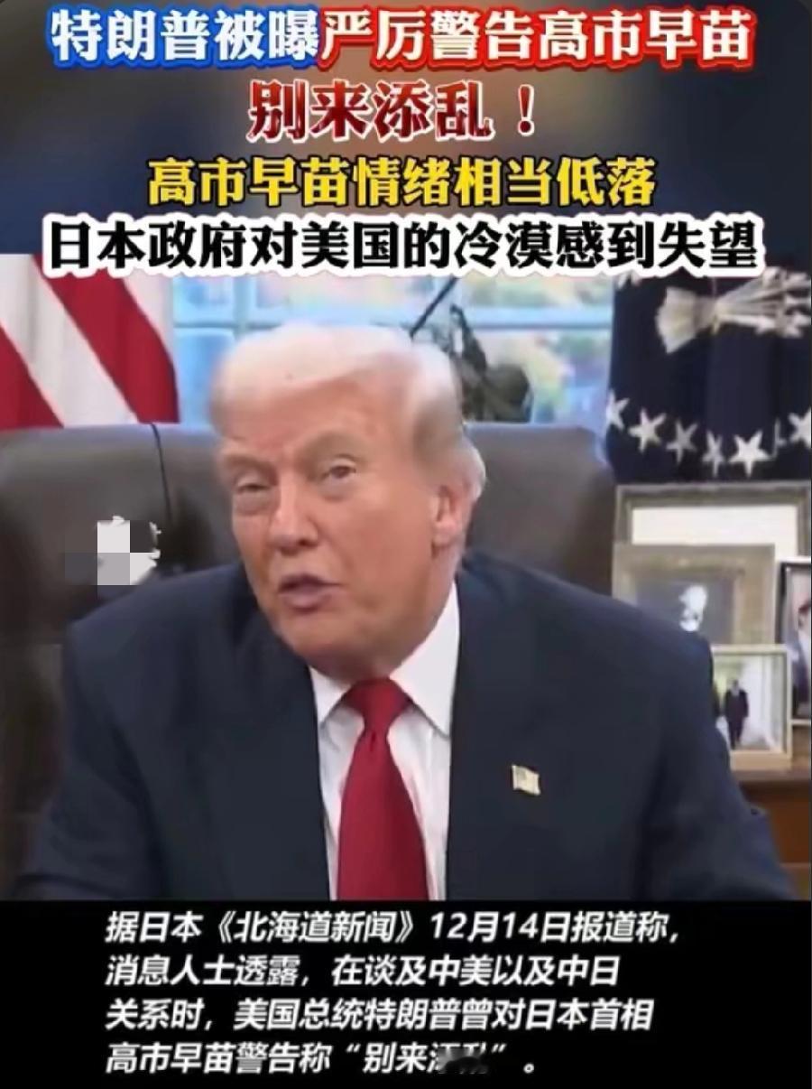 特朗普警告高市早苗“别添乱” 美日博弈升级,亚太格局再添变数 特朗普对高市早苗的“别添乱”警告并非终点,而是美日同盟内部利益再平衡的开端,后续一系列外交动作更凸显亚太格局的复杂博弈。 美方随后通过驻日使馆私下传递信号,明确要求日本在涉台、涉华议题上“保持克制”,避免单方面激化矛盾。这一态度与美方近期推动中美贸易磋商的动作形成呼应——在通胀压力与经济复苏需求下,美国不愿因盟友的激进政策牺牲对华合作空间。与此同时,美方加大了对日本的军事捆绑,宣布将新增驻日美军轮换部队规模,试图以“安全控制”换取日本在外交上的“战略顺从”。 日本国内反应呈现明显分裂:右翼势力对特朗普的警告表示不满,认为美国“牺牲日本利益”;而务实派则主张调整对华姿态,避免被卷入中美对抗的漩涡。高市早苗本人虽未公开回应,但日本内阁近期已悄然搁置多项涉华对抗性提案,转而强调“通过对话解决分歧”,实则是对美方态度的被动妥协。 这场美日内部的“小摩擦”,本质是盟友体系中“主导与从属”矛盾的集中爆发。美国始终将自身利益置于同盟之上,而日本右翼的“军事扩张”与“外交投机”,既难以突破美方的战略管控,也必然遭到中国的坚决反制。后续需警惕日本以“强化美日同盟”为名,暗中推进军事松绑,或在地区议题上采取更隐蔽的挑衅动作。