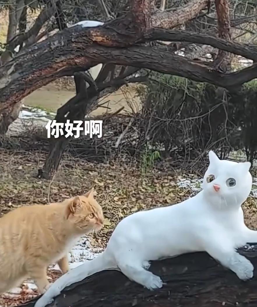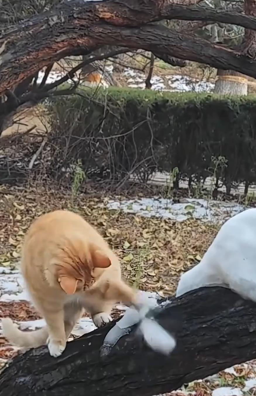 “太逼真了!”河南,初雪过后一位老爷爷心血来潮用雪做的假猫假老鼠,没想到,因为做的过于逼真,竟然将一只流浪猫吸引过来互动,只是它不明白,自己的同伴为什么一动不动,甚至尾巴还被它不小心弄断了 视频中,老爷爷借着雪兴,在树干上堆了一只雪猫,还给它配了只小雪鼠。猫是趴着的姿态,圆眼睛,粉鼻头,尾巴自然垂着;老鼠就在它前爪边,一副鬼鬼祟祟的模样。远远看去,真像一只白猫正屏息凝神,等着扑猎物 没过多久,这件雪塑作品就引来路人围观,大家笑着拍照,都说老爷子手巧,做得活灵活现。但更出人意料的事发生了,一只常在附近活动的橘色流浪猫,也被吸引了过来 它先是远远望着,有点警惕,又忍不住好奇。慢慢凑近后,它先低头闻了闻那只雪老鼠,又抬头打量那只雪猫。凉凉的,没有气味,也不动弹。橘猫伸出爪子,轻轻碰了碰雪猫的前腿,没反应;又绕到侧面,用鼻子蹭了蹭雪猫的脸——还是冷的、静的 它大概困惑极了,明明看起来那么像同类,怎么不理我呢?互动中,橘猫身子一转,尾巴不小心扫到了雪猫的尾巴。雪塑的尾巴本就不结实,轻轻一碰,就断落在地上 橘猫吓了一跳,退后半步,盯着那截断尾,又看看依然蹲坐不动的雪猫,愣了好一会儿,最后带着点犹疑,慢慢走开了。那背影看上去,竟有点像小孩发现自己闯了祸,又不知道怎么办才好 这一幕被人拍了下来,传到网上。很多人看了都觉得又可爱又有点感慨。老爷爷随手堆的雪猫,因为太像,居然唤起了真猫的好奇与试探 这也让人想起自己小时候,堆雪人、捏泥巴,总觉得赋予它们一点像人的模样,它们就仿佛有了生命。如今长大,忙忙碌碌,很少再有那样的闲心和天真了。老爷爷的雪猫,橘猫的互动,在冬日的冷清里,反倒透出一丝温暖的趣味:艺术不必高高在上,它可以从生活中来,又点亮生活,甚至骗过一只猫的眼睛