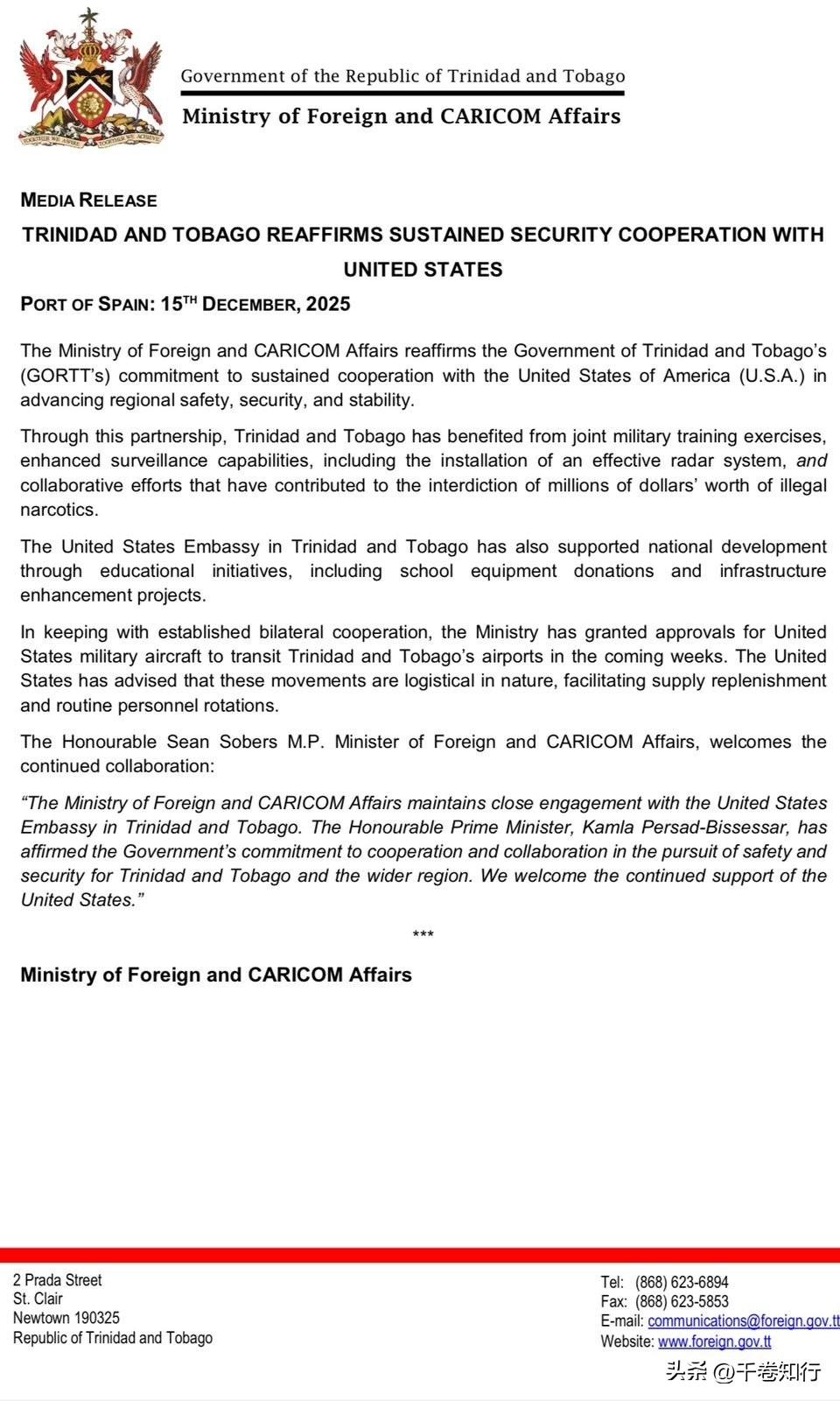【美军战机进驻“邻居家”?离委内瑞拉仅11公里,马杜罗的噩梦来了】 特立尼达和多巴哥这名字听着挺偏,但只要看一眼地图你就懂美国人这招有多狠。这地方离委内瑞拉海岸线也就11公里,什么概念?比北京五环到天安门还近。美军参联会主席前脚刚走,后脚这就批准美军战机过境使用机场,这哪是所谓的“外交合作”,这就是直接在马杜罗家门口架起了一挺重机枪。 美国人前两天刚在海上扣了委内瑞拉的油船,现在又在陆地上搞贴脸输出。卡拉卡斯离这儿也就600公里,战机起飞一脚油门,连预警雷达都反应不过来。这就是美式霸权的“极限施压”:我不一定真打你,但我把枪顶在你脑门上,看你还能撑多久。这根本不是什么过境许可,这是在这个加勒比小国修了个“不沉的航空母舰”。 看着吧,这就是小国的悲哀,特立尼达和多巴哥敢说不吗?当大象要踩死蚂蚁的时候,旁边的草坪是没资格谈主权的。马杜罗这次是真的要失眠了,毕竟邻居借给仇人的不是酱油,而是要命的停机坪。