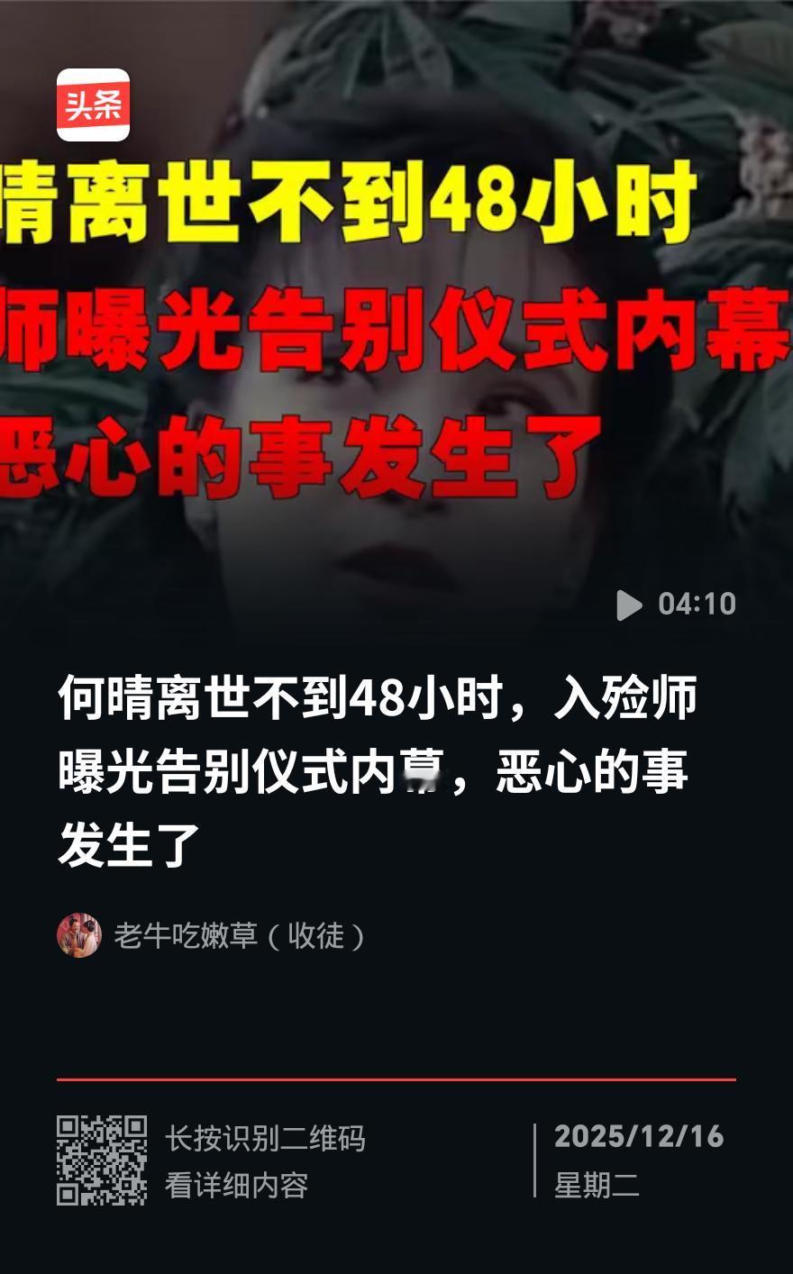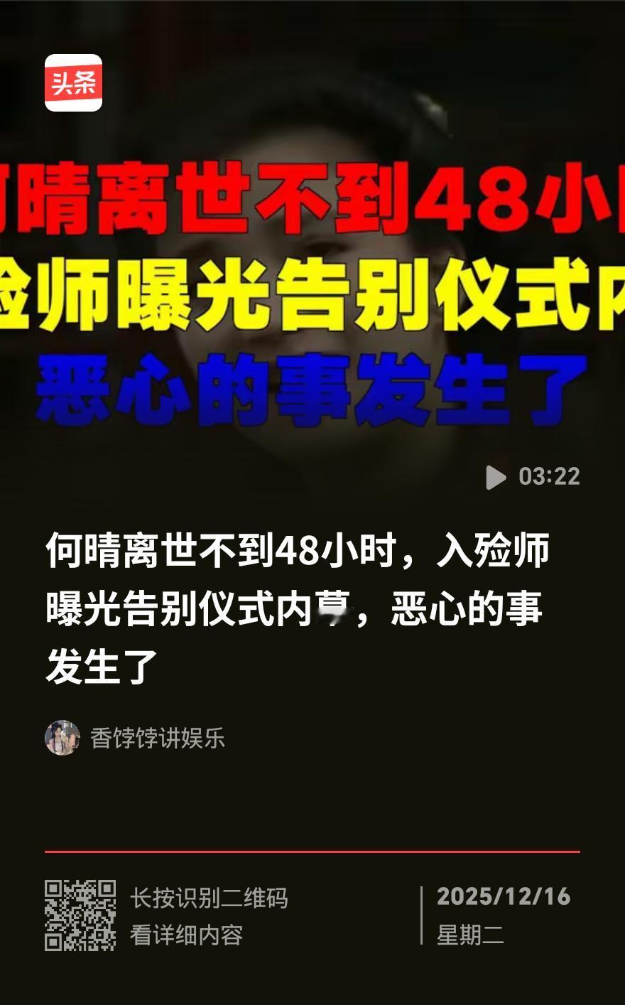 何晴离世不足48小时 告别仪式曝内幕 诸多糟心事引众怒 61岁“古装第一美女”何晴因脑瘤离世,消息传来让无数影迷惋惜不已。谁曾想,她人刚走不足48小时,身后事就接连曝出糟心事,种种乱象惹得众人愤怒。 何晴曾演遍四大名著,塑造多个经典角色,一生低调拍戏。她的命运颇为坎坷,父母皆因脑溢血离世,相似病症最终也降临在她身上。感情方面,她与许亚军的过往曾备受争议,两人爱得轰轰烈烈,分手后也做到好聚好散,共同抚养孩子。 其告别仪式本应低调肃穆,却有自称入殓师的人曝出内幕。大批媒体为博流量,早早蹲守在告别厅外架起设备围追堵截。无奈之下,家属只能悄悄提前举行仪式,只为护住逝者最后的体面。 此外,有好友晒出何晴病重时憔悴不堪的照片,此举引发网友怒斥,认为其消费逝者。更有甚者,借告别仪式上他人背红背包一事恶意攻击,还凭空捏造何晴与廖京生的绯闻,种种行径实在令人齿冷。 逝者已逝,愿这些蹭热度、造谣的人能守住底线,让何晴安息。何晴照片 何晴古装戏 何晴古装戏