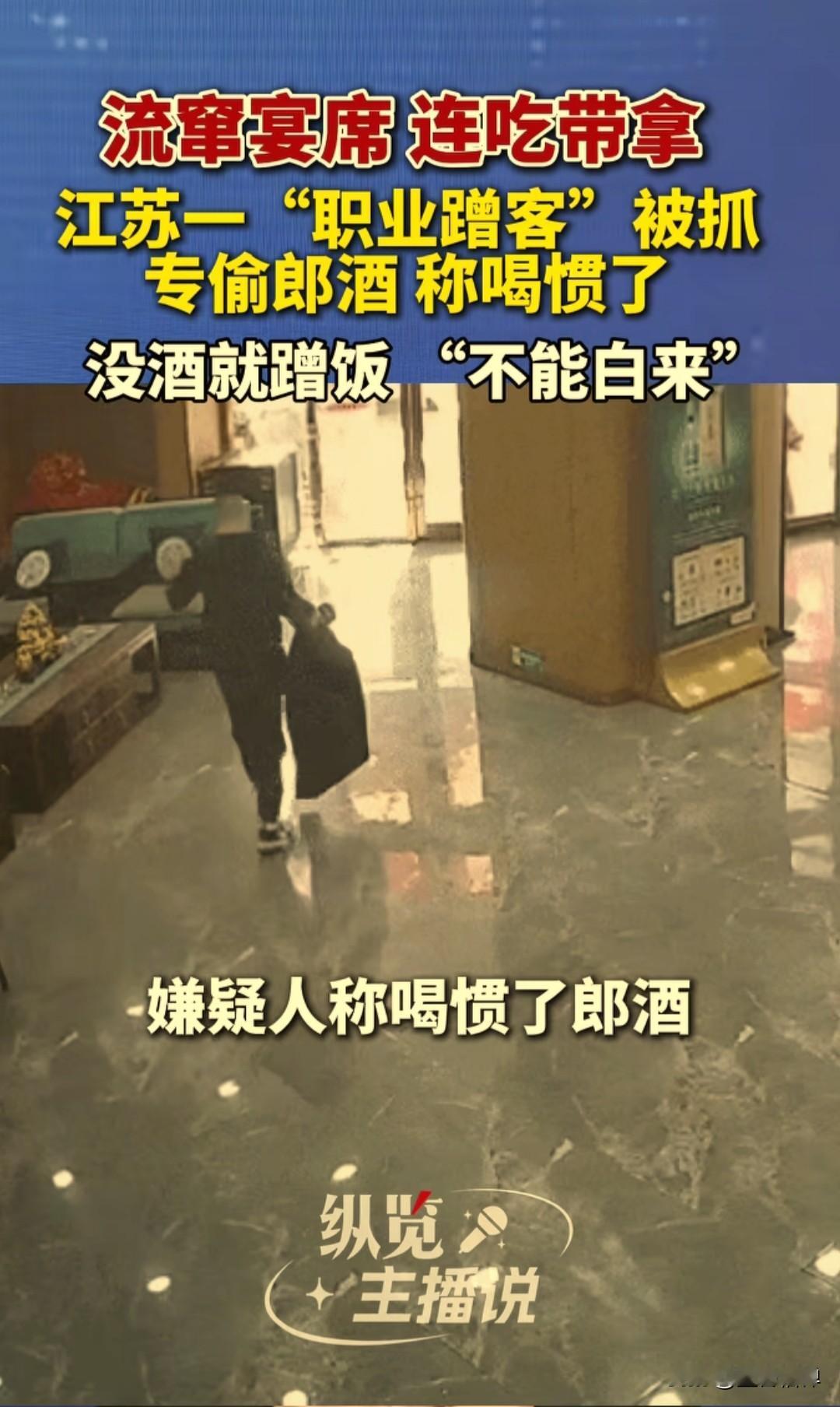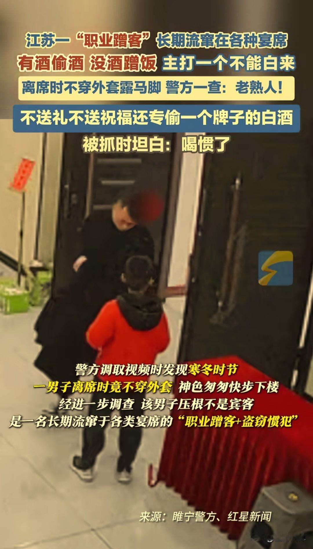 近日江苏徐州睢宁县出现了一名“宴席刺客”,长期流窜于婚礼、寿宴、乔迁宴等各种宴席。和主家不认识,也没被邀请,他先打听哪里有宴席,然后过去提前蹲点,看这家宴席用的什么白酒品牌。 这名男子喜欢喝白酒,对“郎酒”这个品牌独爱有加,要是宴席上是“郎酒”,他就找机会偷走,如果不是,他就混一顿饭然后走人。 睢宁市民张女士在一家酒店举办婚宴后,清点物品时发现两瓶“红花郎10”不翼而飞,随后报警。警方调取监控后发现,这么冷的天气,一名男子吃完席离开的时候竟然不穿外套,拎着外套神色匆匆快步下楼。 经过进一步调查,这名男子不是被邀请的宾客,而是一名长期流窜于各类宴席的“职业蹭客”,也就是盗窃惯犯,民警展开抓捕。 到案后这名男子称,专门偷这个品牌白酒的原因竟然是自己喝惯了,所以只偷这个牌子的,目前,该男子因盗窃罪被公安机关依法处以行政拘留8日。 来源:睢宁警方 法治最前线