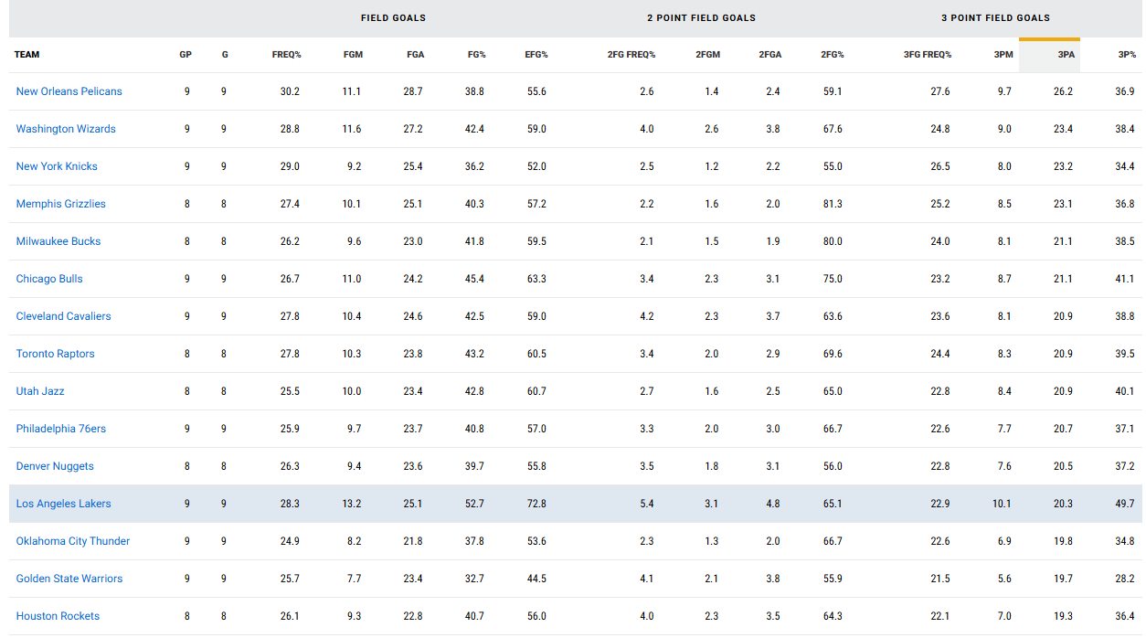 纠正一个前几天评论区看到的错误观点——本赛季湖人是联盟给大空位三分(包括半空位三分)最多的球队。我不知道这个是从哪看的,但自己去查了下数据,发现这并不是一个事实——而且发现了一些对球队有利的数据。实际上,本赛季湖人给对手大空位三分的次数是联盟第13(图1);给对手半空位三分次数是联盟第9。(而且给半空位三分多并非一定意味着坏事,雷霆这项数据联盟第2多)哪怕我们把筛选范围缩小到湖人防守最崩的最近9场——他们给对手的大空位三分也没变多多少。(图2)相反——单看数据,他们最近比较悲催的反而是被投篮随机性惩罚了:最近九场,对手面对湖人的三分命中率是42.8%,联盟第一;其中大空位三分命中率是恐怖的49.7%,也是联盟第一。这和他们11月(对手三分命中率36.3%),以及上赛季全明星后(卢卡湖,35.6%)的表现大相径庭。我又翻了下比赛记录,发现“被随机性惩罚”这事确实存在。(诸位有兴趣也可以翻看一下)这个发现,让我对湖人的防守回调多了一点点信心——随机性有时会惩罚你,就有时会眷顾你,最终这个数字还是大概率会回归一个平均值。当然,我的意思不是防守不需要提升和调整了——湖人的防守还有别的问题存在,我也还在继续复盘录像——但可能——我们也不需要太太太太过度反应。(比如吵着分锅、交易某某某、勒令教练下课、号称本赛季已经毫无希望等等)也许,这支球队的防守还没到“无药可救”的地步?洛杉矶湖人