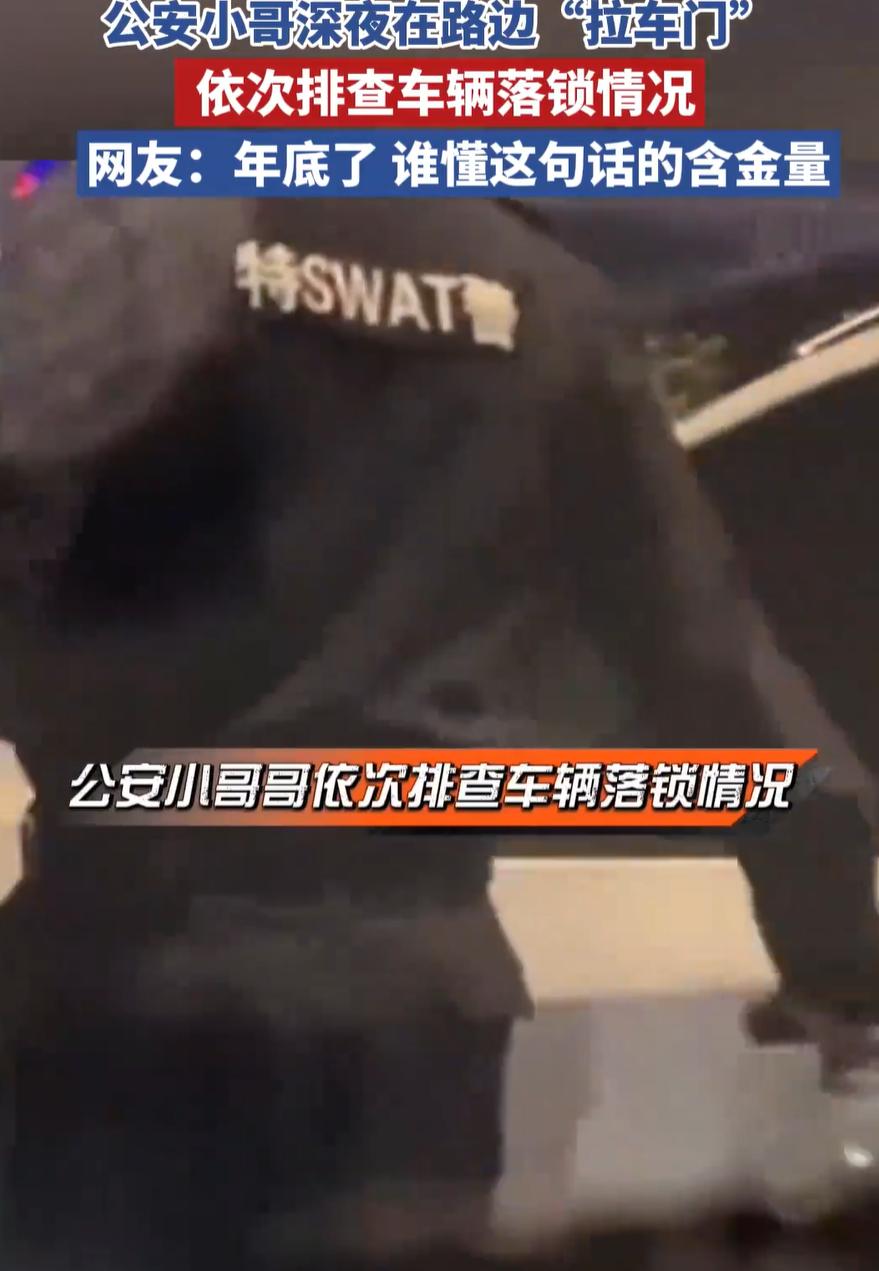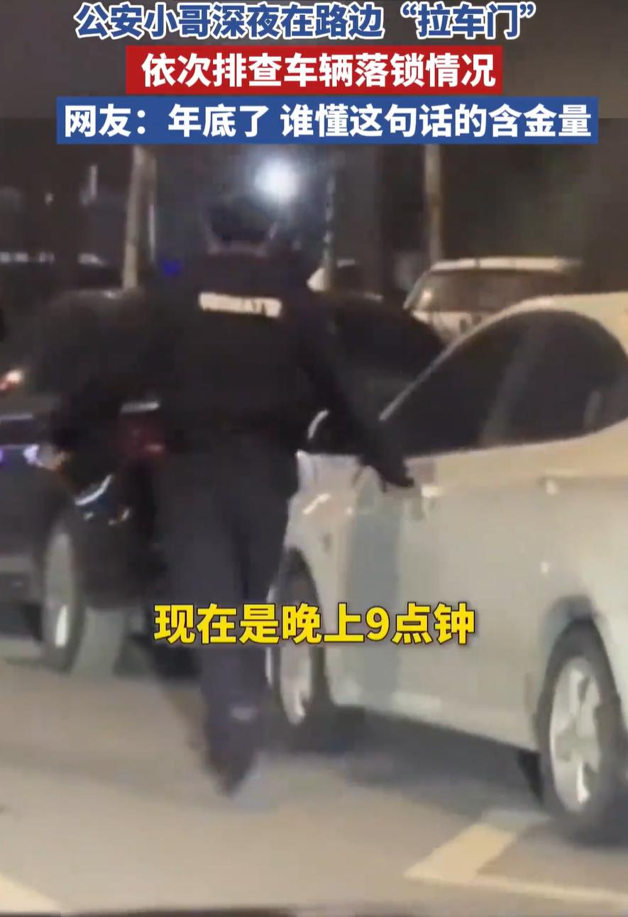 太暖了!山东德州,一名男子晚上开车,远远看到路边有人挨着车拉车门。男子以为对方想做坏事,下意识跟了上去,车开近了才发现不对劲,对方背后清清楚楚写着特警。不是图财,也不是试探,是在一辆一辆确认车门有没有锁好。网友:年底了,谁懂这句话的含金量 视频中,这名特警没有同伴,没有警车灯光,就在夜里沿着路走,拉一下,确认一下,继续往前。动作很简单,也不显眼,可真要换个角度看,这就是很多车主一觉睡到天亮、什么都没发生的原因之一 男子反应过来后有点不好意思,也挺自豪,顺手把视频发出来,说:这是我们陵城的公安,值得点个赞。话不多,但情绪很到位 这一幕,也引起不少网友共鸣,其中一位网友表示:今年大年初一晚上十一点多了,一个陌生号码打我电话,接通直接告诉我车没锁,我说不可能,结果人家说我是陵城公安,我就在你车旁边,你赶紧锁上,那一瞬间特别特别感动 为什么年底这句话含金量这么高。因为大家都清楚,越到这个时候,事多、人杂、心也容易乱。能有人替你多看一眼、多走一步,说句车没锁了,这不是多大的事,却刚好落在普通人最在意的地方 这类巡查,其实很难被注意到。没出事的时候,没人知道他们做过什么。一旦真丢了东西,所有细节都会被放大。可恰恰是这些不起眼的确认,把很多麻烦挡在了前面 站在普通人的角度说一句实在话,大家要的从来不是口号,也不是多高调的表现,而是这种你没开口、但有人已经替你想到了的踏实感。晚上车停在路边,家里人睡得安心,第二天还能正常出门上班,这种安全感很具体 为他们点个赞!