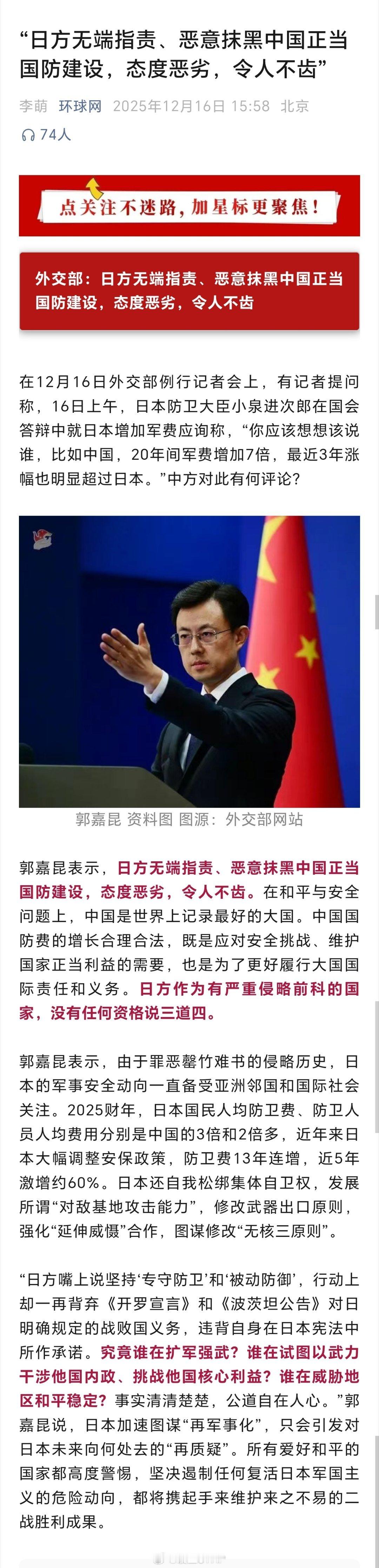 日方没资格对中国国防建设说三道四外交部发言人郭嘉昆表:日方无端指责、恶意抹黑中国正当国防建设,态度恶劣,令人不齿。在和平与安全问题上,中国是世界上记录最好的大国。中国国防费的增长合理合法,既是应对安全挑战、维护国家正当利益的需要,也是为了更好履行大国国际责任和义务。日方作为有严重侵略前科的国家,没有任何资格说三道四。