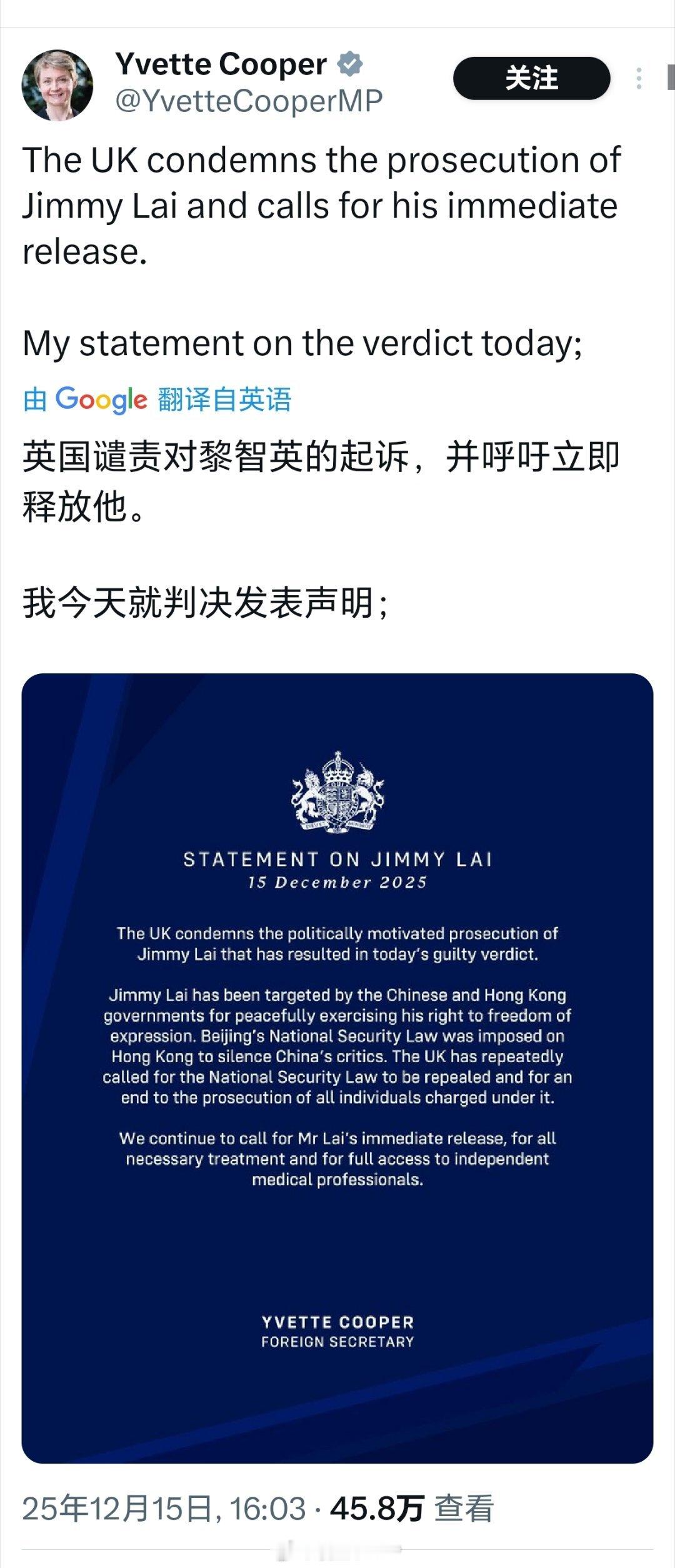 英国外交大臣呼吁释放黎智英遭批英国外交大臣库珀发声明,呼吁释放黎智英、引网友群