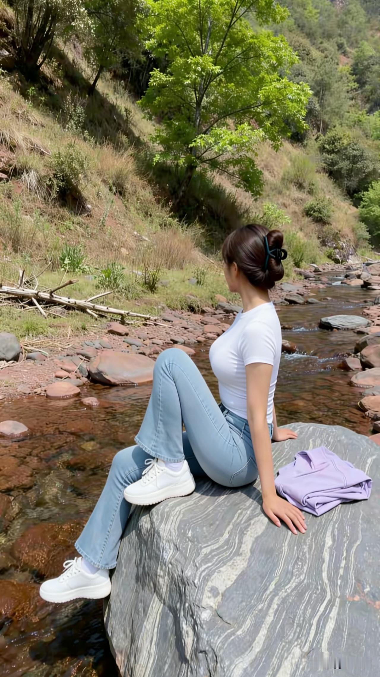 《溪畔闲坐》 青石巉岩枕碧溪,晴光潋滟照芳堤。 云鬟松挽簪轻绾,素袂微扬拂草萋。 坐对澄波观漱玉,闲依叠嶂听莺啼。 溪声泠泠摇石影,山色葱葱入眼迷。 风送林香侵袂角,光浮水纹漾阶西。 暂抛尘事耽幽趣,静享烟霞忘世机。 遥看峰峦青霭外,近观鱼戏绿萍低。 此身恍入桃源里,一任心随云影移。