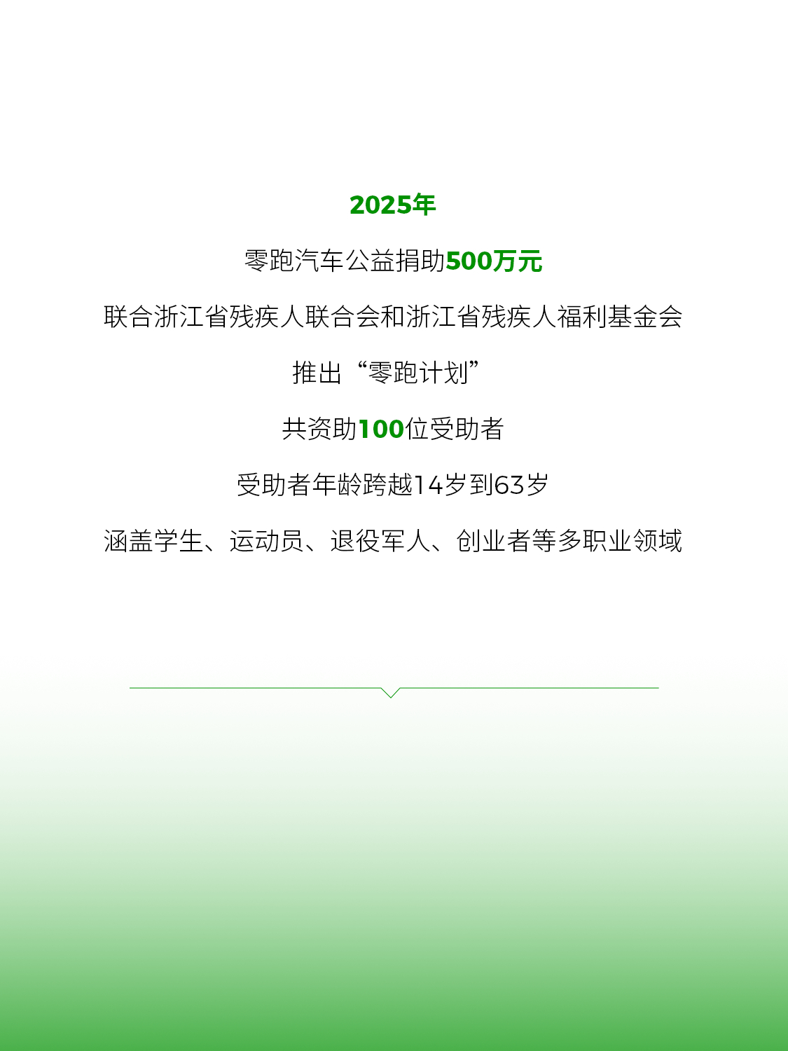 践行科技向善,零跑与每一位受助者同行向前2025年,零跑汽车公益捐助500万元联合浙江省残疾人联合会和浙江省残疾人福利基金会推出“零跑计划”,共资助100位受助者点击大图,看他们如何重新定义人生的边界零跑10年向上领跑零跑计划与您同行零跑的卓越10刻零跑汽车