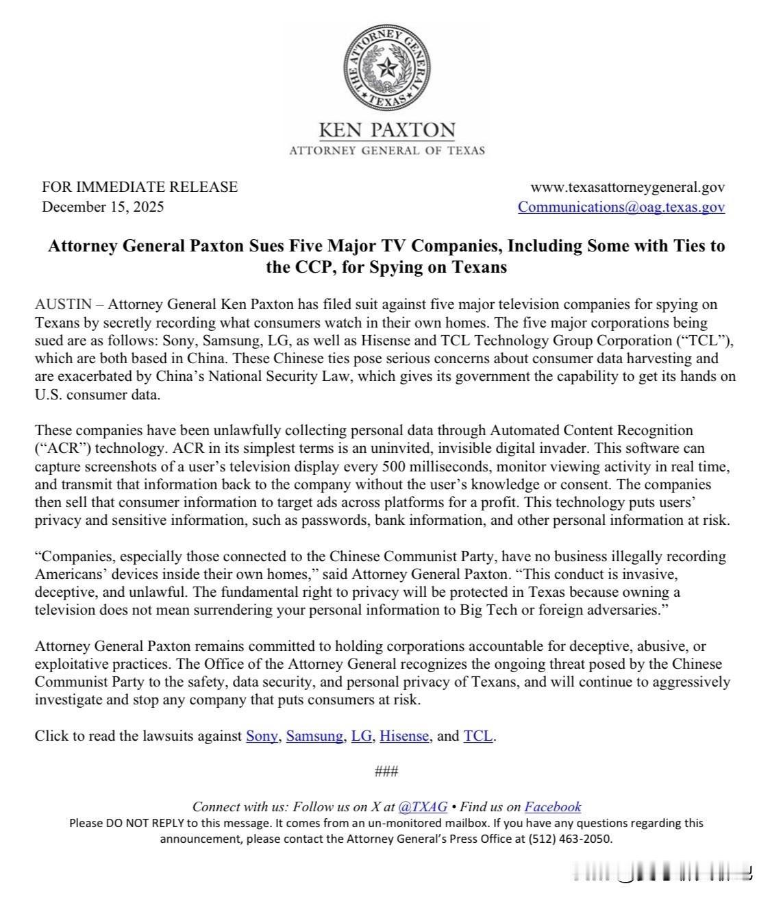 根据德克萨斯州总检察长博克斯顿在社交媒体上的贴文,他要起诉东大的电视机公司,表示将运用德克萨斯州法律严厉打击所谓的“间谍软件”。 帕克斯顿准备起诉五家公司,有索尼、三星等,中国公司是海信和TCL。他指控厂家“通过电视机监视德克萨斯州居民”。 这确实是美国的悲哀,以前听到美国政客挂在口上的阴谋论,总以为是少数人的偏见。但一个州检察长煞有介事地指控中国造电视机有所谓的间谍软件,说明美国人已经脆弱到杯弓蛇影的地步。 连美国人都在贴文中揶揄他,德州即将迎来一座金矿,因为有商家要引进中国的扫地机器人了。到时候是不是可以指控“中国正在非法绘制美国家庭住宅地图”? 补一句评论,接下来这哥们是不是要说中国电饭煲正密谋摧毁北美防空司令部?