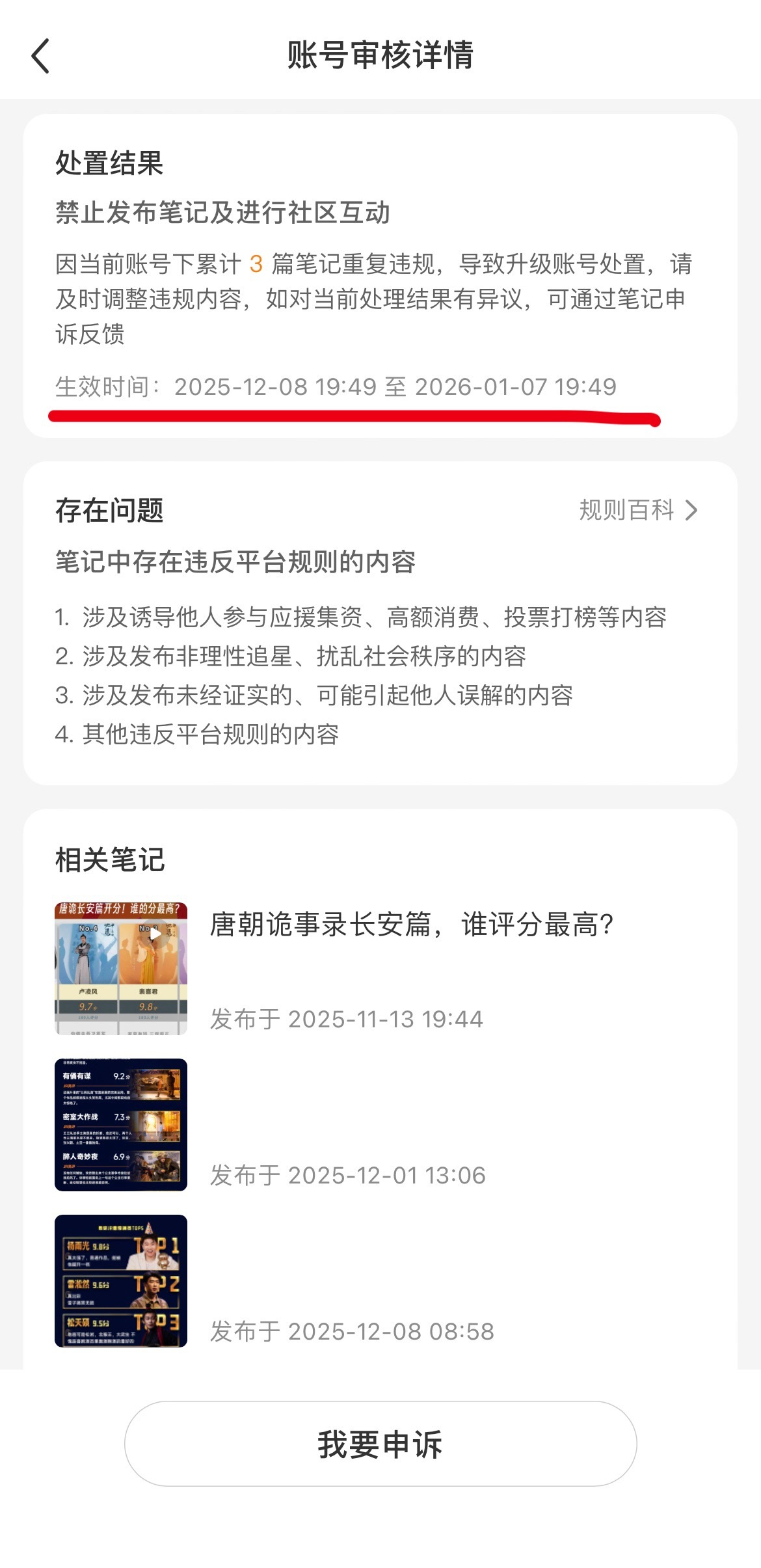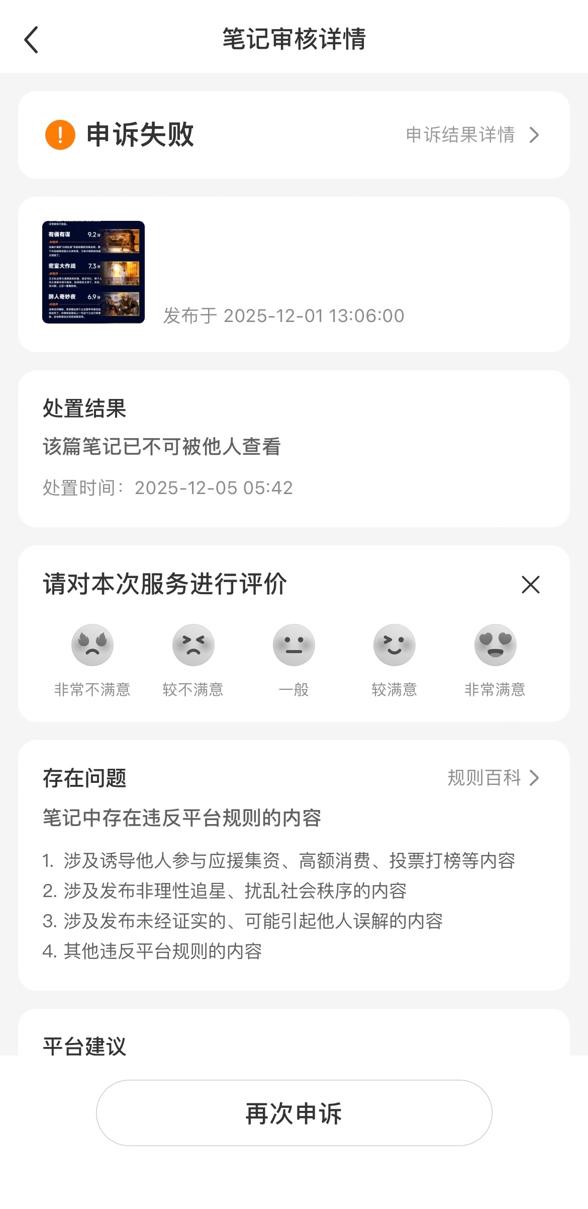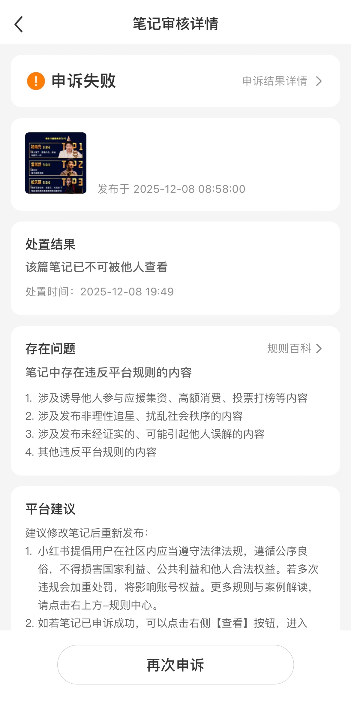 您好!我们是专注分享虎扑评分的账号运营者,我方小红书账号【虎扑评分】自 2024 年注册以来,始终坚守合规底线,专注输出来自虎扑app的真实评分内容。截至目前,我们已在小红书账号【虎扑评分】连续发布 10期《喜人奇妙夜2》节目评分相关内容,所有评分均源自虎扑社区真实用户反馈,每条内容都附带有评分来源标注,有理有据、客观中立,从未涉及违规表述或不当引导。但在发布《喜人2半决赛》节目评分后,账号突然被封禁,收到的封禁原因我们完全无法认可,且多次申诉无果,这让我们深感困惑与不解。封禁到期后,发布《喜人2决赛》节目评分后又再次被封禁,这次封禁时长长达一个月。现我方困惑如下:1.内容从未涉及任何应援集资、高额消费或投票打榜的诱导;2.仅分享节目评分,无任何非理性追星表述,更谈不上扰乱社会秩序;3.评分均有明确来源凭证,绝非未经证实的信息。且申诉无果,这让我们深感困惑与不解。作为长期合规运营的创作者,我们尊重平台对社区环境的维护,但也迫切需要清晰、透明的审核标准和具体违规说明。恳请官方告知此次封禁的详细原因,若为系统误判,盼能尽快协助解封账号。同时也希望通过此次沟通,让更多创作者明确合规边界。我们已整理好相关内容的发布记录截图、虎扑来源凭证,随时可配合核查,期待您的正面回应!