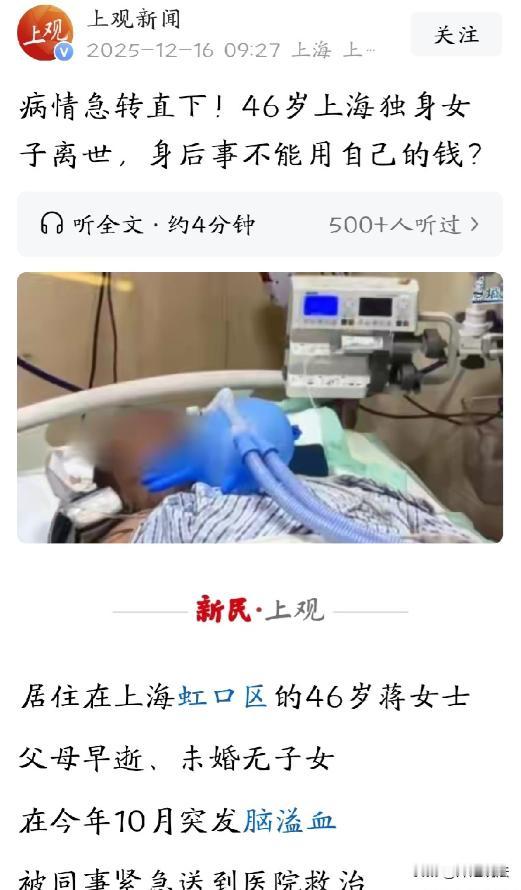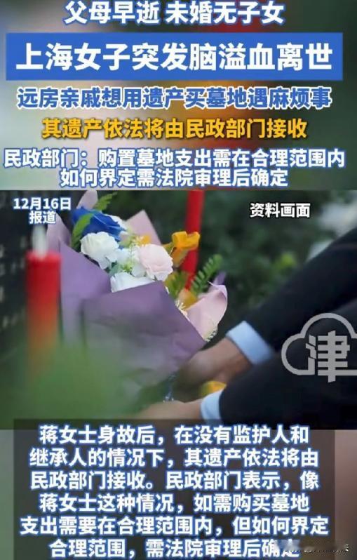 上海,46岁的蒋女士一辈子未婚未育,父母早逝,独自生活,上班时她突发脑溢血,情况危急需手术,却因无近亲签字犯了难,只能联系远房表弟吴先生,吴先生赶到医院签字,还和公司垫付3万医药费,后又为专家会诊垫付1万,可居委会突然将蒋女士转到民营康复医院,病情恶化后她不幸离世,表弟吴先生想用她的遗产买墓地、办追思会,却遭居委会拒绝,民政部门解释也让他无奈。 (来源:上观新闻、都市快报) 46岁的蒋女士,一辈子没结婚也没孩子,父母走得早,一直孤孤单单。 10月12日上班时,她突然头晕没力气,同事送她到医院,一查是脑出血,得马上手术,可没家属签字不行。 蒋女士被紧急送到医院后,整个人意识模糊,身体状况极差,医生们迅速展开检查,确诊是脑出血,情况十分危急,必须马上进行手术,否则生命危在旦夕。 然而,医院有规定,手术必须要有家属签字同意才能进行,可蒋女士的父母早已离世,又没有子女,兄弟姐妹也不存在,一时间根本找不到能签字的人。 医生们,一边全力稳定蒋女士的病情,一边四处寻找她的亲属。 同事们围在病房外,也是满脸焦急。他们虽然关心蒋女士,但按照规定没有签字资格。 大家你一言我一语地商量着,突然有人想起蒋女士有个远房表弟吴先生,不过平时联系很少,一年也见不上几面。 抱着试试看的心态,同事赶紧联系上了吴先生,吴先生接到电话后,心里咯噔一下。 虽然和蒋女士联系不多,但毕竟是亲戚,他顾不上多想,立刻放下手中的事情,火速赶到了医院。 吴先生赶到医院时,看到病床上昏迷不醒的蒋女士,心里一阵难过,他没有丝毫犹豫,在手术同意书上签下了自己的名字。 同时,考虑到蒋女士的经济状况,他和蒋女士的公司一起垫付了3万块钱的医药费,希望能让蒋女士得到及时的治疗。 在大家的期盼中,蒋女士被推进手术室。 几个小时后,手术室的灯灭了,医生走出来告诉大家,手术还算成功,蒋女士暂时脱离了生命危险。 吴先生和同事们松了一口气,以为蒋女士会慢慢好起来。 可没想到,后续的治疗并不顺利。 为了蒋女士能得到更好的康复治疗,居委会做出了一个决定,将蒋女士转到了民营康复医院。 吴先生虽然有些担忧,但也觉得居委会可能是为了蒋女士好,便没有反对。 然而,转院后蒋女士的病情却突然恶化。吴先生得知消息后,心急如焚,立刻赶到医院。 看着蒋女士痛苦的样子,他心疼不已,为了能让蒋女士得到更专业的治疗,吴先生又垫付了1万块钱的专家会诊费用。 但尽管大家付出了这么多努力,蒋女士的病情还是没能得到控制。 12月14日,蒋女士最终还是离开了人世。 吴先生看着蒋女士的遗体,心里空落落的,他想着,蒋女士这一辈子孤苦伶仃的,走得这么突然,得给她办个体面的后事。 于是,吴先生提出要用蒋女士的遗产买块墓地,再办个追思会,让蒋女士走得安心。 可当他把这个想法告诉居委会时,却遭到了拒绝,居委会表示这事他们管不了,让吴先生找民政部门。 吴先生又找到民政部门,民政部门的工作人员解释说,蒋女士没有继承人,遗产有特定的处理方式,不能随意用来买墓地办追思会。 这让吴先生感到十分无奈,他怎么也想不通,自己为表姐付出了这么多,怎么就不能用她的遗产办点事呢。 难道吴先生真的就不能动用蒋女士的遗产吗? 根据民法典规定,对遗产管理人的确定有明确说明。没有继承人或者继承人均放弃继承的,由被继承人生前住所地的民政部门或者村民委员会担任遗产管理人。 在这个案件中,蒋女士没有继承人,所以民政部门成为了她的遗产管理人。 对于遗产的使用,民法典也有规定。遗产管理人应当妥善保管遗产,处理被继承人的债权债务。吴先生想用蒋女士的遗产买墓地、办追思会,这属于对遗产的处分行为。 民政部门称吴先生可以书面申请使用遗产,但支出要在合理范围,而且后续的维护费用要由吴先生承担。 这是因为遗产的使用要遵循合法、合理的原则,不能随意挥霍。 合理范围需要法院来认定,这是为了保证遗产使用的公正性和合法性。 现在有很多像蒋女士这样独居的人,他们没有直系亲属,一旦遇到紧急情况,就会面临无人照顾、遗产处理困难等问题。 目前当地民政正联合多部门想办法,争取尽快制定出合理的解决办法。 蒋女士的遭遇让人感到惋惜,人生充满了变数,不知道明天会发生什么,提前做好规划,不仅是对自己负责,也是对关心我们的人负责。 吴先生垫付的医药费,能不能从蒋女士的遗产中优先偿还呢? 根据民法典规定,继承遗产应当清偿被继承人依法应当缴纳的税款和债务,缴纳税款和清偿债务以遗产实际价值为限。 吴先生垫付的医药费属于蒋女士生前所欠的债务,所以他可以向相关部门申报债权,在遗产范围内优先受偿。 对于此事,你怎么看呢?