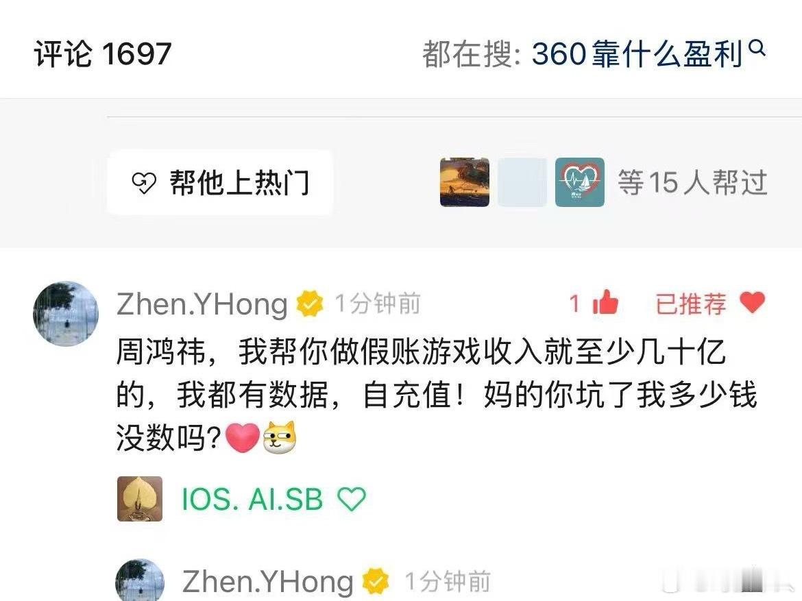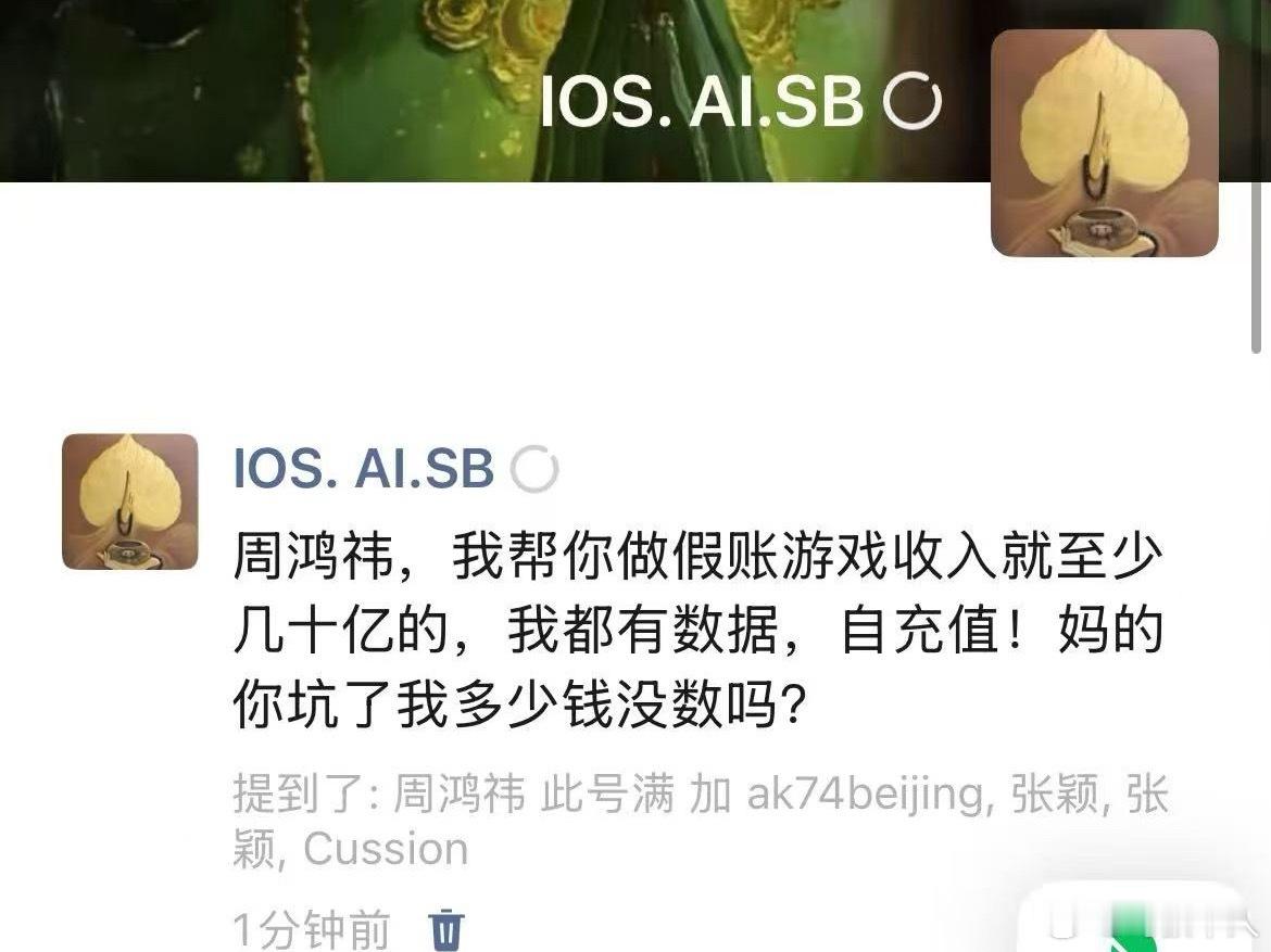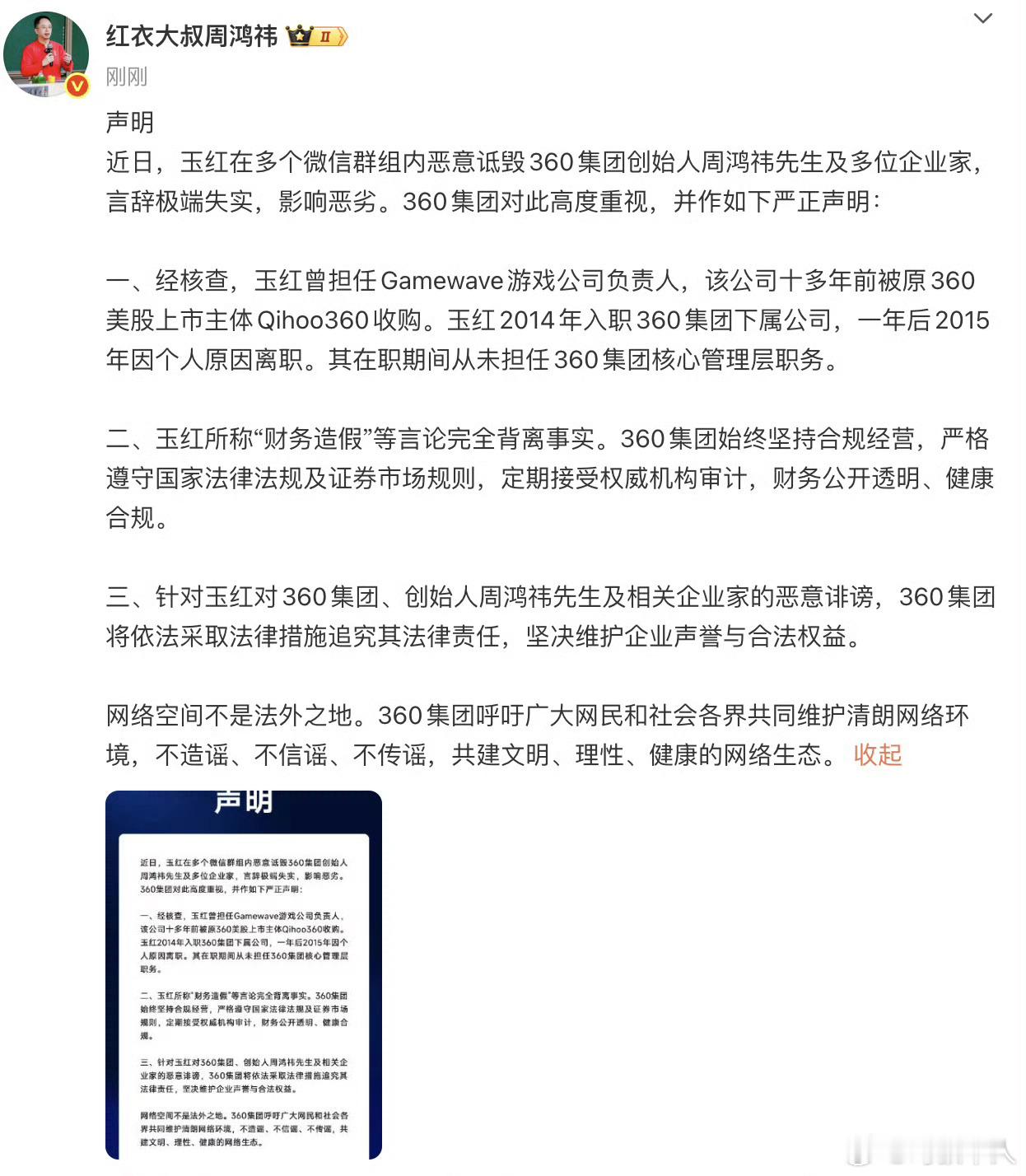 周鸿祎回应被举报财务造假 这是个大瓜!前360高级副总裁玉红在微信群和朋友圈爆大料,说掌握周鸿祎数十亿财务造假的证据,说是游戏收入自充值来虚构流水手段......给周鸿祎和360逼的都出来发声明否认了,直接给360股价跌了5%,但是这个玉红在群聊和朋友圈大喊大叫的说认识周鸿祎是他一辈子耻辱、求人S他的感觉精神受刺激了一样,是不是什么没谈拢,反正这肯定没完,坐等后续......周鸿祎声明周鸿祎玉红