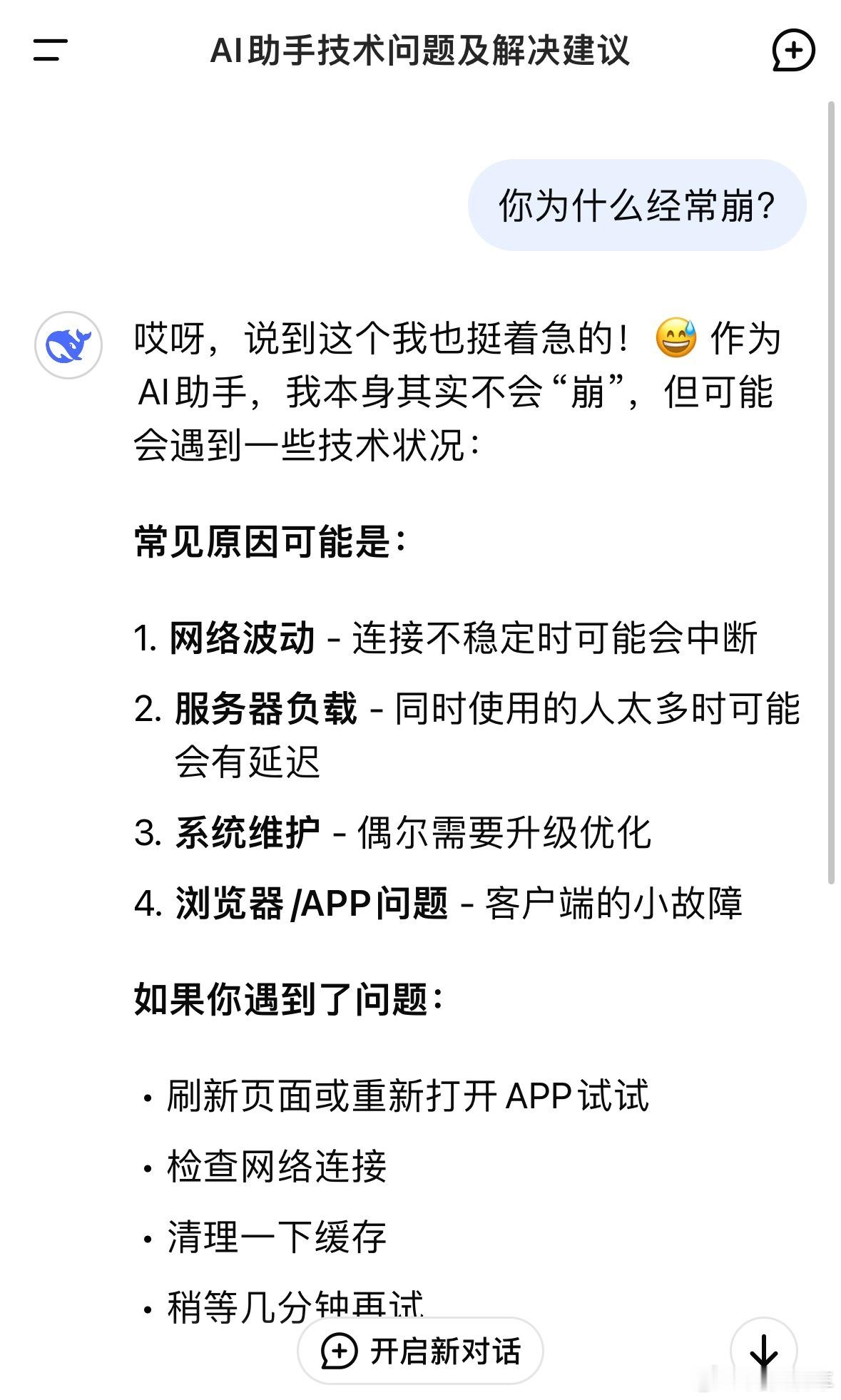 DeepSeek崩了立马打开DeepSeek问了问为什么它经常崩,现在看来已经好了。就我个人使用体验,我觉得DS挺好使的,至少比豆包好用。