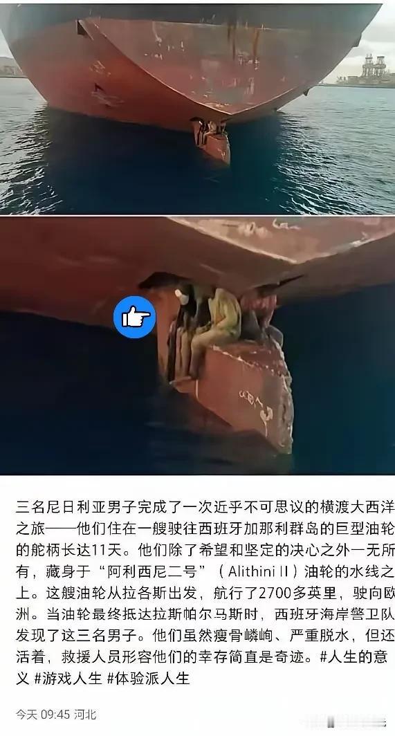 大千世界无奇不有! 奇迹总是在发生,你敢想象有人能坐在远洋轮船的船舵上,长达14天!只为能逃离他们的国家? 这仨尼日利亚大哥是真玩命啊——躲油轮舵柄上漂了14天跨大西洋,脚离海水就半米,几天之后他们的食物和水吃完了,不得不喝含盐的海水,最后饿了渴了没东西,瘦得脱相还能活着! 更可笑的是他们连船去哪的都搞错了!本以为是去欧洲国家的过上更好的生活,结果这艘船是去巴西的,并不是去欧洲,好在他们被救援人员发现并救下 你说这哪是“体验人生”?分明是逼到绝路了才赌命。看着他们蜷在锈铁上的样子,我直冒冷汗!要不是运气好遇上救援,早喂鱼了。 这种“奇迹”太扎心——谁不想安稳过日子?真到没辙了,才会拿命换个盼头。咱看着像“奇闻”,对他们是拼了命的活路
