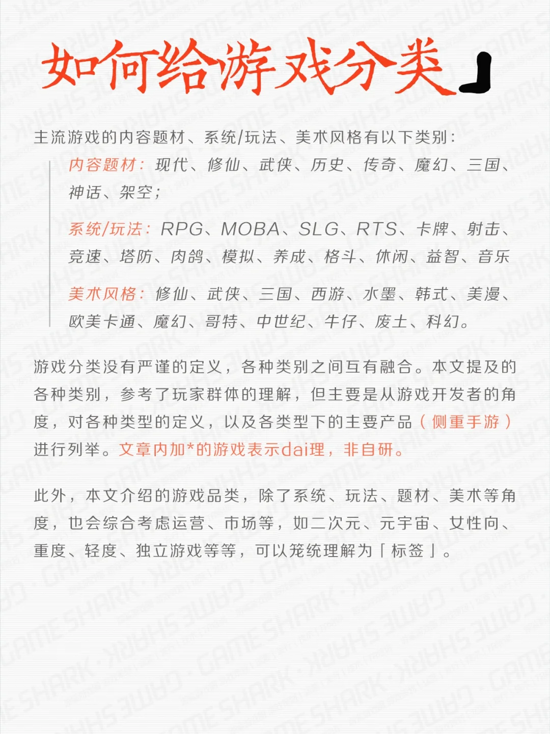 游戏玩家应该都熟悉RPG、SLG、MOBA、沙盒、塔防、养成、射击等,对各种游戏类型的称呼。那么这些「称呼」具体指的是什么,它们定义了游戏的哪些属性? 我们先从几款游戏的介绍语入手: 《原神》:「开放世界冒险RPG」,开放世界和RPG是系统/玩法,冒险既是系统也是题材; 《江南百景图》:「古风模拟经营类手游」,古风是美术风格,模拟经营是系统/玩法; 《阴阳师》:「3D日式和风回合制RPG手游」,3D日式和风是美术风格,回合制RPG是系统/玩法; 《一念逍遥》:「水墨国风放置修仙手游」,水墨国风是美术风格,放置是系统/玩法,修仙是题材。 可以看出,一款游戏的介绍语通常由两到三部分组成,即内容题材、系统/玩法、美术风格。其中美术风格和内容题材(概念设定)一脉相承,可以归为一类。内容题材、系统/玩法可以任意组合,形成各种风格的游戏,二者也是游戏最主要的分类依据。 从玩家角度来看,游戏类型定义了游戏的玩法、题材等,玩家对这些感兴趣就会去玩。从设计角度来说,游戏类型定义了系统框架、收费模式、游戏设定等等属性。比如,如果是MMORPG游戏类型,游戏通常会有等级、装备、战斗系统,需要在社交和数值上下功夫。