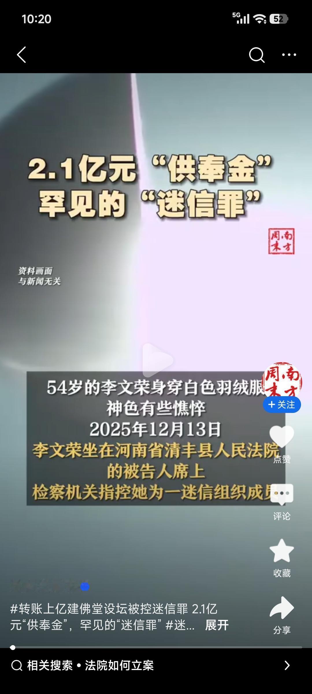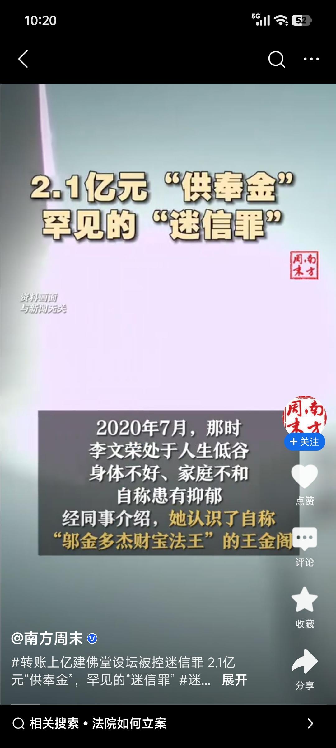 最近,54岁的李文荣因“供奉”2.1亿被控迷信罪,这事真让人唏嘘。她曾是经营教育集团,丈夫搞房地产的“成功女性”,却在人生低谷时陷入迷信陷阱。2020年,她身体不好、家庭不和还抑郁,经同事介绍认识了自称“邬金多杰财宝法王”的王金阁。王金阁用“堪事破局”“加持发功”等手段,一步步骗取她的信任。他给李文荣母亲“做了法事”收33万多,赐她法名,还通过视频“开示”。这2.1亿几乎是王金阁迷信组织敛财总额的全部。迷信就像黑洞,吞噬了她的财富和理智,真该提高警惕啊。