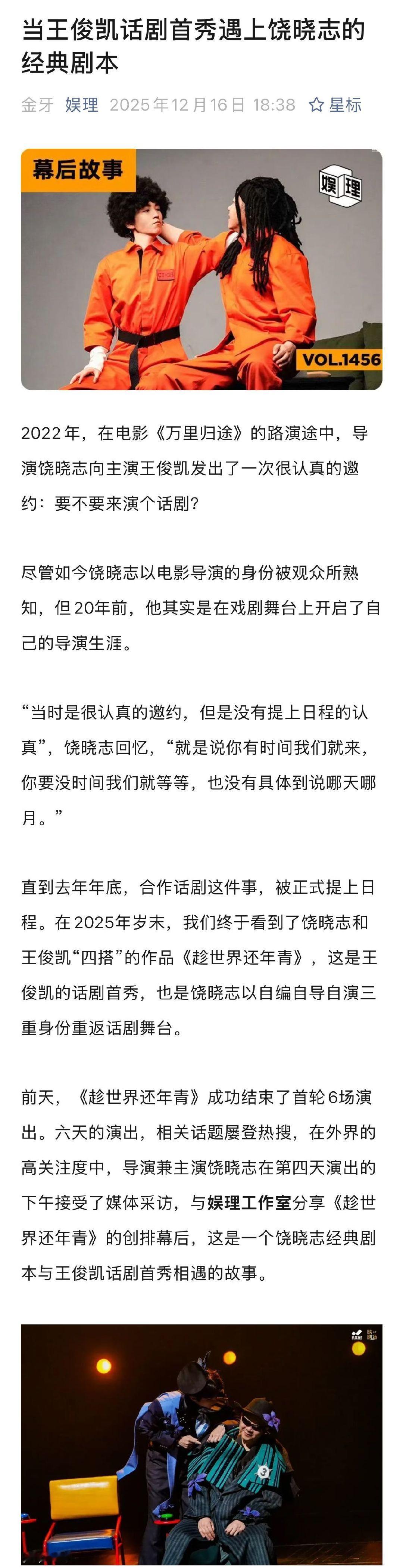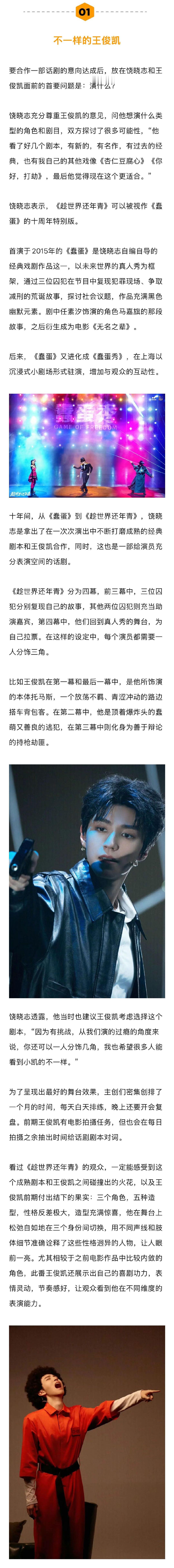 饶晓志说王俊凯演戏没有杂念 饶晓志说王俊凯背词特别快 《趁世界还年青》对饶晓志的另一个挑战是,台词非常密集,背词难度很大,“我的第三段对我来说挺有难度的,整个戏我的词儿是最多的,再加上年纪也大了,你看小凯才20多岁,他背个词儿咔咔就下来了。” 对于王俊凯的这次完全解放天性,饶晓志表示:“他没有杂念,他是个职业的演员。”娱理独家↓