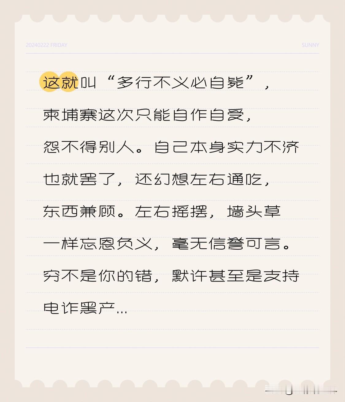 这就叫“多行不义必自毙”,柬埔寨这次只能自作自受,怨不得别人。 自己本身实力不济也就罢了,还幻想左右通吃,东西兼顾。左右摇摆,墙头草一样忘恩负义,毫无信誉可言。 穷不是你的错,默许甚至是支持电诈黑产那就是你的罪。为了一点点眼前利益,邻国无数人的生命财产惨遭不测。这是赤裸裸的犯罪! 泰国这次铁了心得猛揍柬埔寨。战场上被别人虐成狗,周边却连一个调停拉架的都没有。洪森好好反思一下!痛定思痛,悬崖勒马!柬埔寨 柬埔寨局势 柬埔寨洪玛内 柬埔寨冲突 邻国柬埔寨 柬埔寨国际地位 柬埔寨扫诈