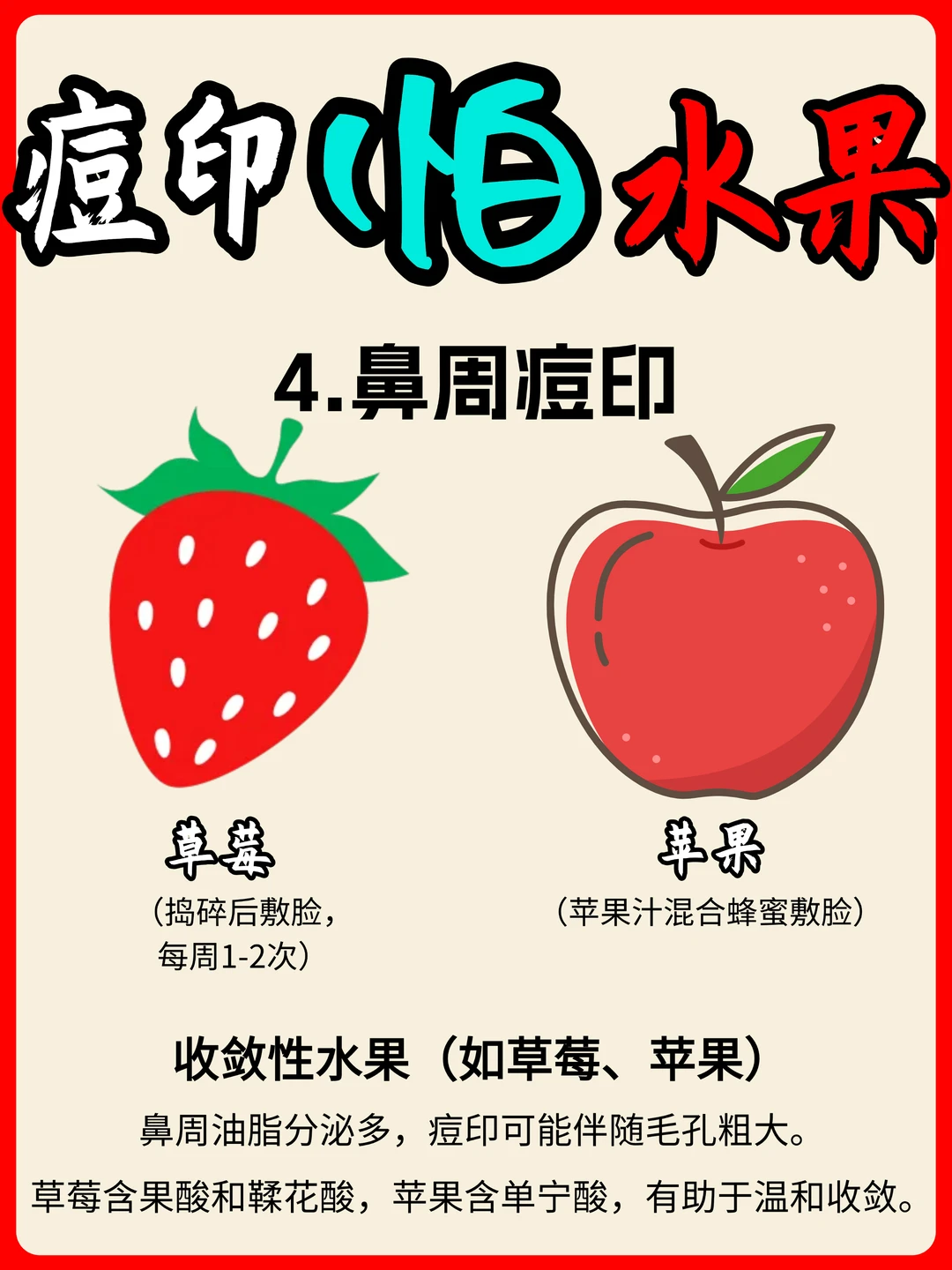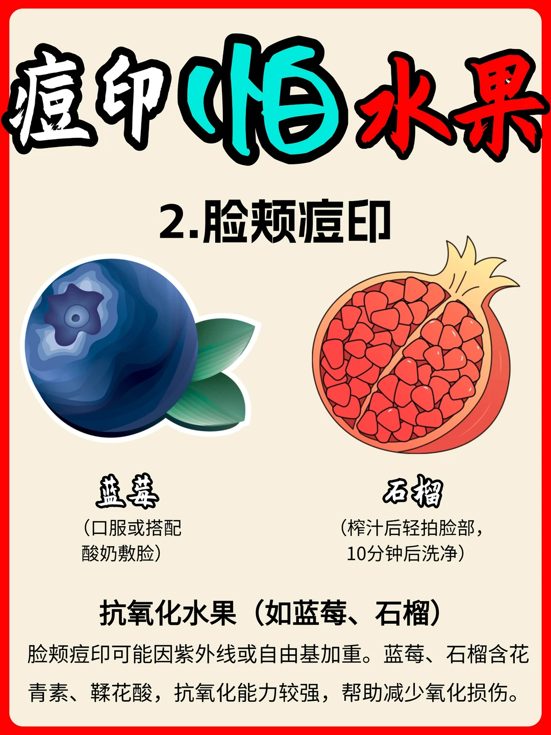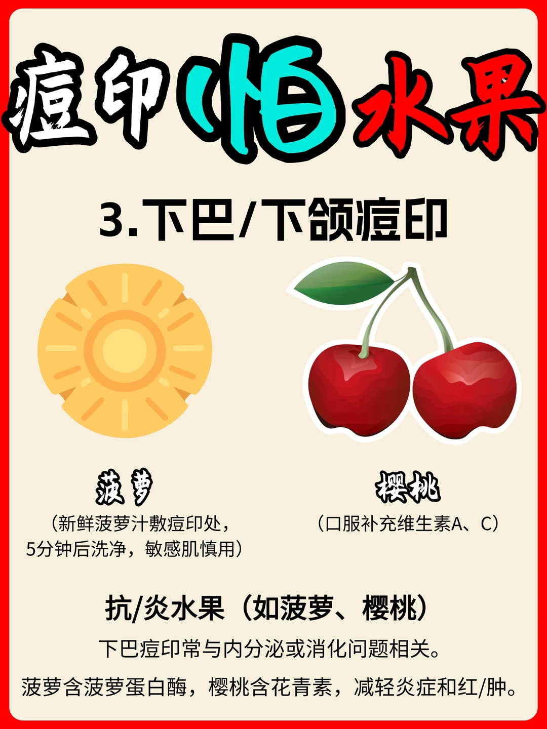 💡额头痘印:熬夜党必备!柠檬/猕猴桃榨汁湿敷(需稀释),高维C狙击黑色素~ 🍍下巴痘印:菠萝蛋白酶+樱桃花青素,消炎王者!果汁敷5分钟,内服双倍见效。 🫐脸颊痘印:蓝莓酸奶面膜+石榴汁拍脸,花青素抗氧救星,紫外线损伤退退退! 🍓鼻周痘印:草莓果酸泥+苹果蜂蜜膜,收敛毛孔超温和,油脂痘印一起溜~ 🌟Tips:敏感肌先测耐受,水果护肤后记得防晒!