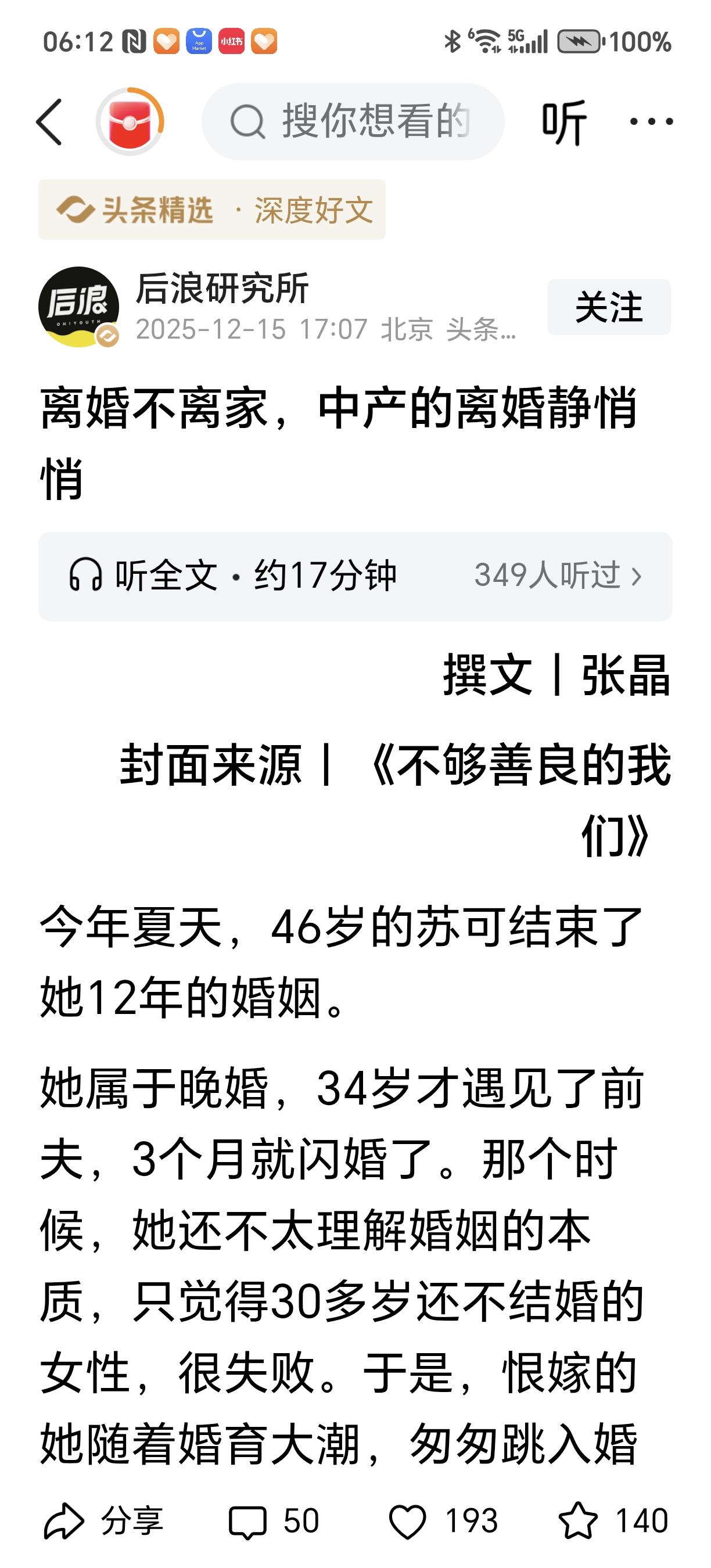 这是头条号“”后浪研究所”发表的一篇的文章,文章名是《 离婚不离家,中产阶级的离婚静悄悄》,撰文张晶。 感觉文中苏可的前夫有点爱无能,其实不光是前夫,苏可也是爱无能。可能现代人都是爱无能,只爱自己。 前几天参加一位94岁老人的葬礼,这位老人是我的姑父。我88岁的姑妈红着眼圈絮絮叨叨:一起走过了70年28天,他的样子我实在是忘不了。听老妈说姑父姑妈相识时,姑父相当于是孤儿,他们刚结婚时非常贫穷,租住别人的一个房间,生了孩子摇窝就放在房间里。后来日子才慢慢好起来。 那样艰苦的环境,他们也相濡以沫,爱得深沉。姑父长得帅,脾气非常好,总是笑眯眯的,挣的钱全给姑妈,姑妈很能干,里里外外一把手, 四个孩子都很争气,也很孝顺。 现代人条件好了,却都像苏可的前夫有了提防之心,双方都不愿意为对方多付出一点,只关注自己过得舒服自在,婚姻也确实没有了存在的意义。 不知道这是社会的进步,还是退步呢?
