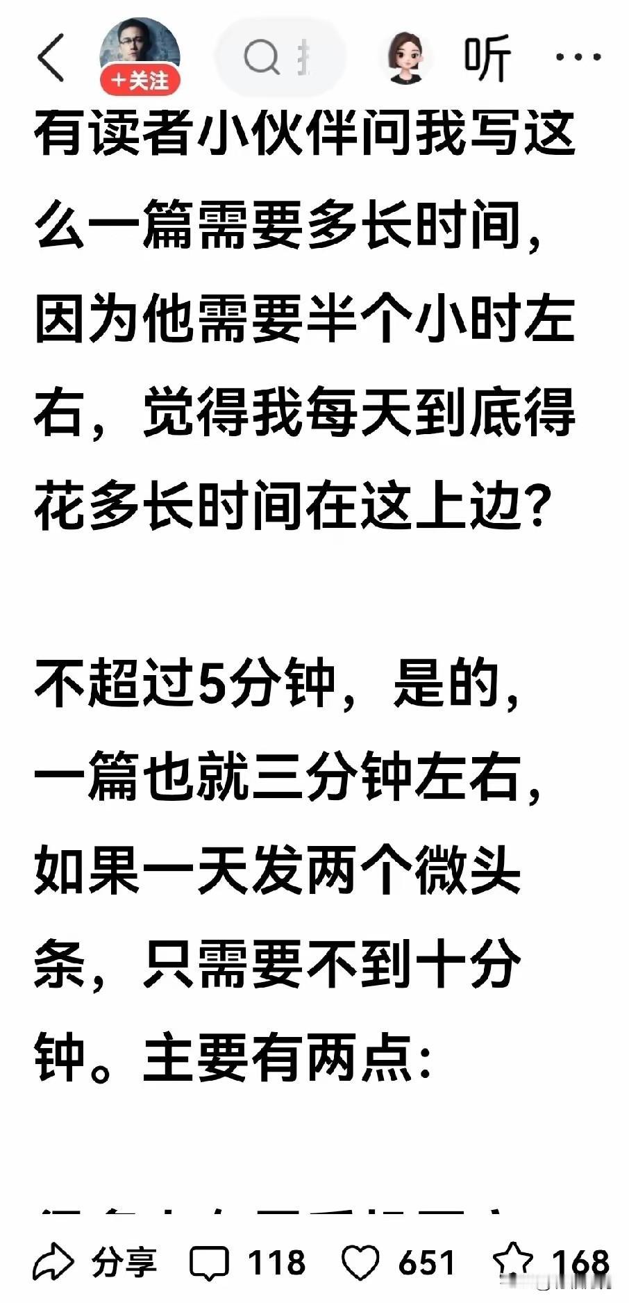 九边说他现在写一篇微头条只需要3、4分钟,主要得益于两点:一是因为他是用电脑输入,速度快;二是因为写得多了,易如反掌。 九边说得当然有道理,高效工具加持之以恒总会让你有收获,但能有多大收获就不好说。对于普通发布者来说,写一篇微头条用时3分钟还是半个小时其实不太要紧,关键是选题难,普通人的视野没那么宽,怎么选出合适的话题大费脑筋与时间。而且没什么影响力,大V随便一句话就可以有数万阅读量,这个也羡慕不来。 而且你费劲扒拉地扣出一篇自己满意的小作,平台不给展现,那真是挺伤积极性的,关键是你还莫名其妙,不知道错在哪里[捂脸]。不过在这点儿上大V所受的限制会更多,也算是可以自我平衡的一个点,且行且珍惜吧。[笑哭]