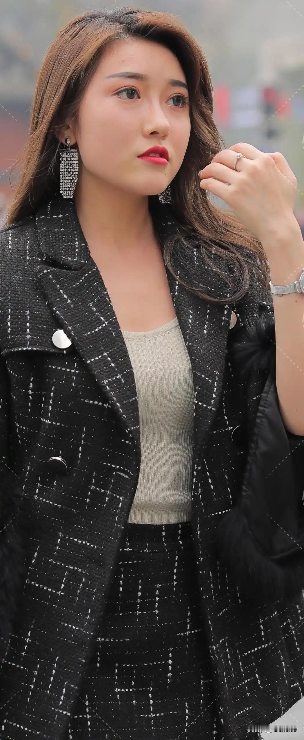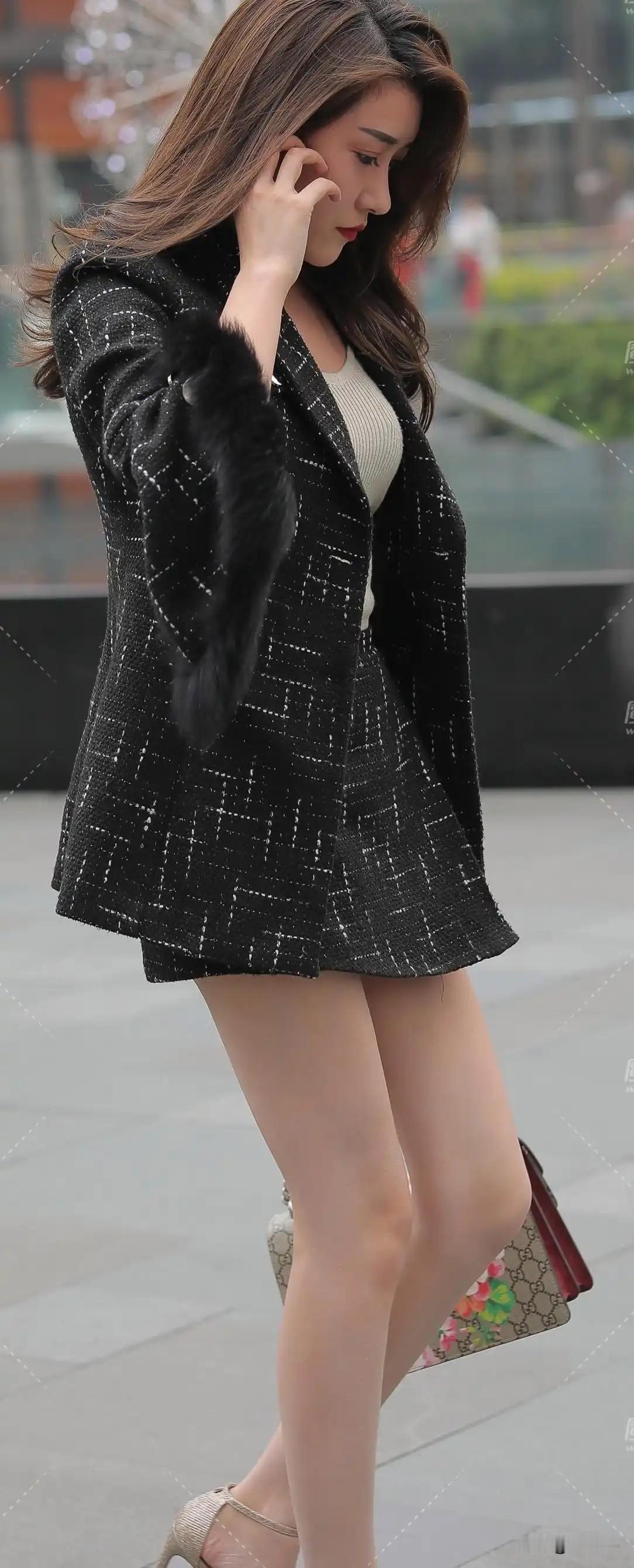 都市时尚女孩,黑色亮片外套,花色手袋,优雅步伐