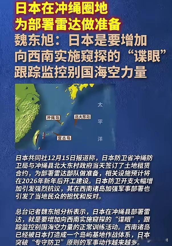 种种迹象表明,日本对中国已是磨刀霍霍,新的一场中日战争,似乎将变得难以避免,清算日本军国主义时机已到,今日新加坡联合早报,报道了日本在冲绳西南岛屿部署雷达部队的消息。 日本12月16日报道:“为了应对中国军事威胁,日本将在冲绳县最东端的离岛北大东岛,部署航空自卫队移动式警戒管制雷达部队。”日本自卫队战略前移,也预示着日本挑起战争可能将加大,中国绝不可掉以轻心。 作为二战的战败国,中国也完全按照敌国条例,对日本本土不宣而战,这是联合会授予的权力,日本明知挑衅危险,但仍一意孤行不思悔改,注定被痛击也是显而易见的,中国实力就摆在那里,不信你就试试,胆敢“以身试法”看会不会被打残!友友怎么看欢迎点赞评论分享。
