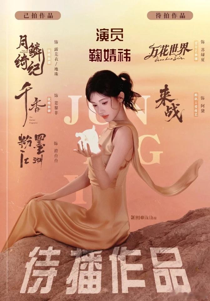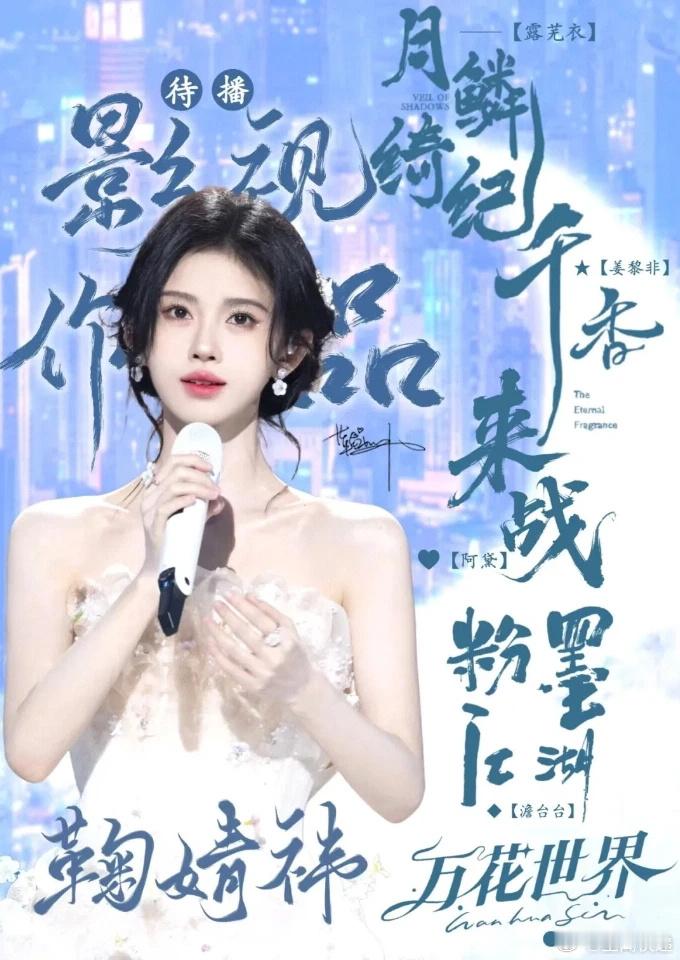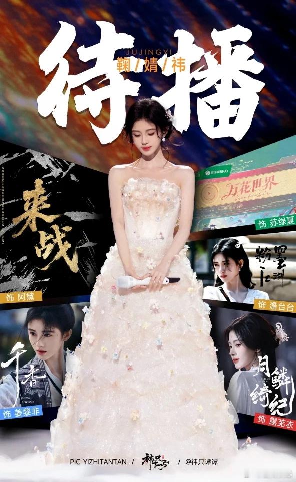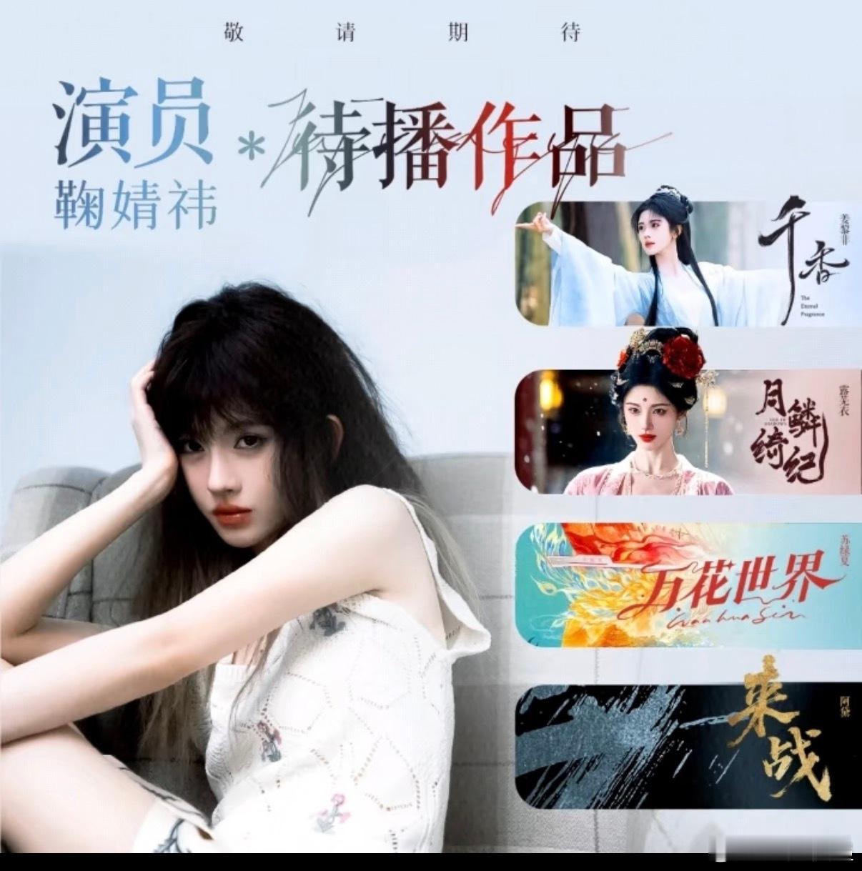 鞠婧祎有4部待播剧鞠婧祎有《月鳞绮纪》《千香》《来战》《万花世界》四部待播剧,其中《月鳞绮纪》预计2026年1月14日播出。《万花世界》鞠婧祎 饰苏绿夏《来战》鞠婧祎 饰 阿黛《月鳞绮纪》鞠婧祎 饰 露芜衣《千香》鞠婧祎 饰 姜黎非鞠婧祎 鞠婧祎有4部待播剧