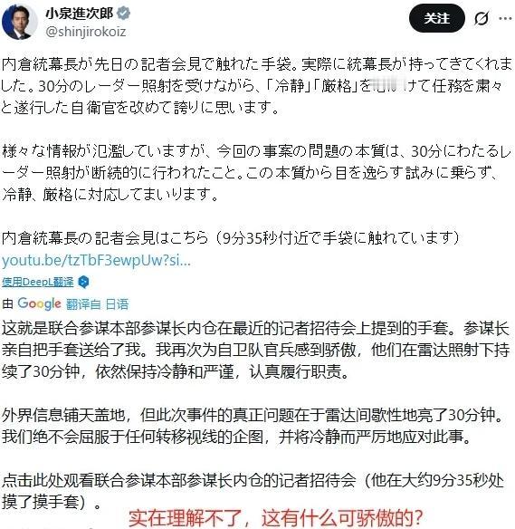 战机被锁定30分钟 日本不敢面对现实,尴尬了 面对雷达照射事件的持续发酵,中方晒出了一系列指向日方战机存在蓄意挑衅的详细证据。日本防卫大臣小泉进次郎再次在社交媒体上回应,却几乎避开所有实质问题。他反复强调,日本战机受到中方雷达锁定长达30分钟,至于中方所列出的事实与证据,他完全没有正面回应,表现出一种捂住耳朵自说自话的态度。 小泉的发言还带有浓厚的表演成分。他不仅转移话题,还附上了现任自卫队统合幕僚长内仓宏明曾担任飞行员时期使用过的手套照片,试图通过这一颇为生活化的细节表达对日本飞行员能在压力环境下坚持30分钟的骄傲。这样的举动,不仅让人摸不着头脑,也引发了日本网友的集体困惑。实际上,把被雷达照射期间的坚持当成荣誉,本身就像是在安慰挨了批评的小孩,并不能掩盖问题本身。 这一操作,无疑给人的印象是日本政府将危机当成舞台,只顾喊口号、摆造型,仿佛只要言辞激烈、情绪高涨,现实矛盾就会自动化解。日本网友对此失望甚至无语,不少人直接吐槽将防务领导力流于表面艺术,把现实外交迅速切换成戏剧画面,好像只要镜头到位,就算完成任务。 根本上看,日方目前回避中方证据,固守雷达照射论点,只会加剧双方误解和紧张气氛。应对这类突发安全风险,空洞的自信和形式感远远不够,最终还是要靠事实沟通和有效协商解决。按照当前发展趋势,日方继续以情绪化手法推诿,很难给后续局势带来积极转变。