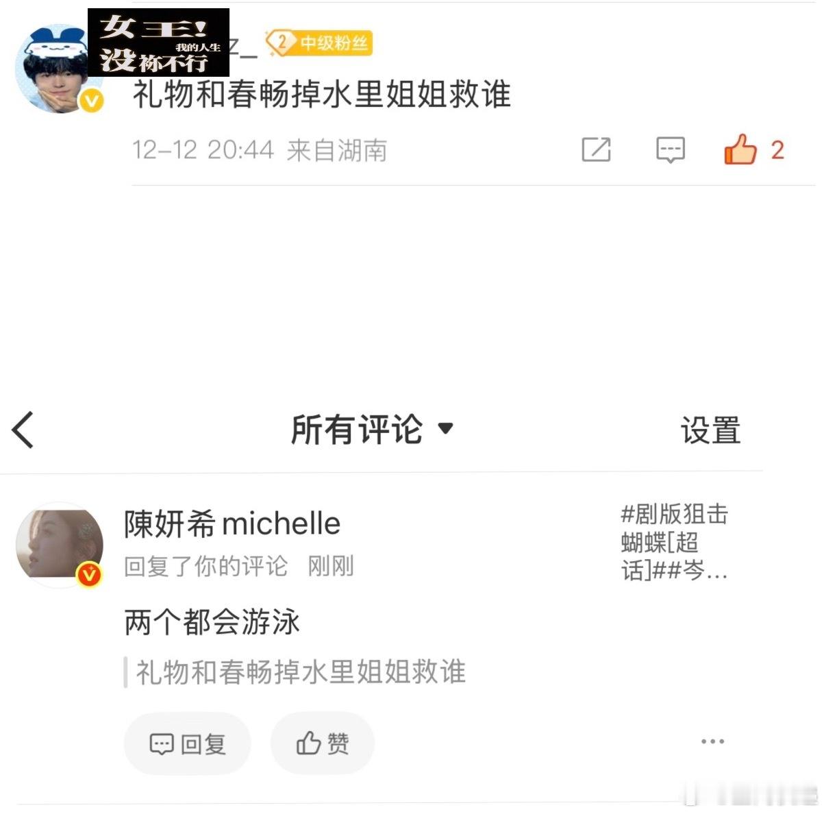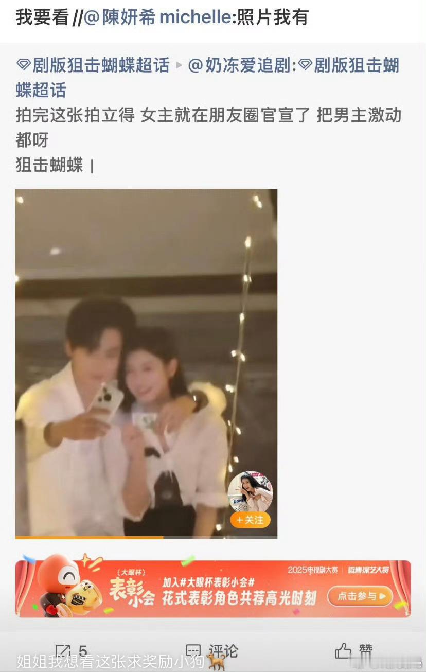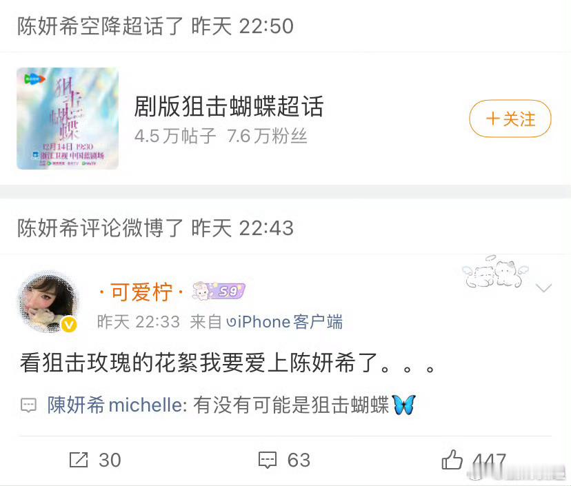 陈妍希回复剧粉谁能拒绝这么宠粉的陈妍希啊!《狙击蝴蝶》剧宣里她把高情商宠粉玩明白了难怪被剧粉夸成“宠粉天花板”,这样的宣发互动请多来点儿!狙击蝴蝶 陈妍希回复剧粉