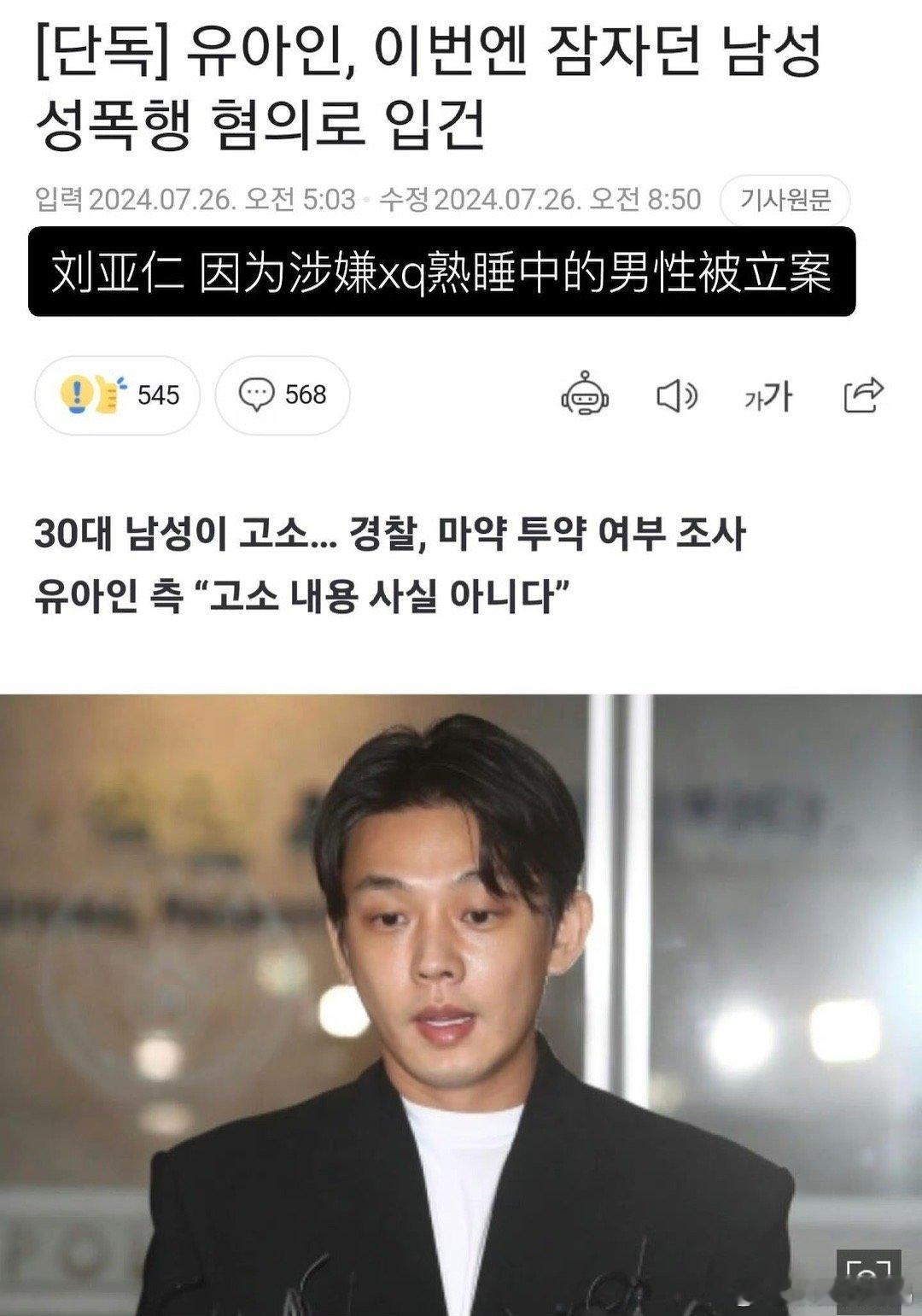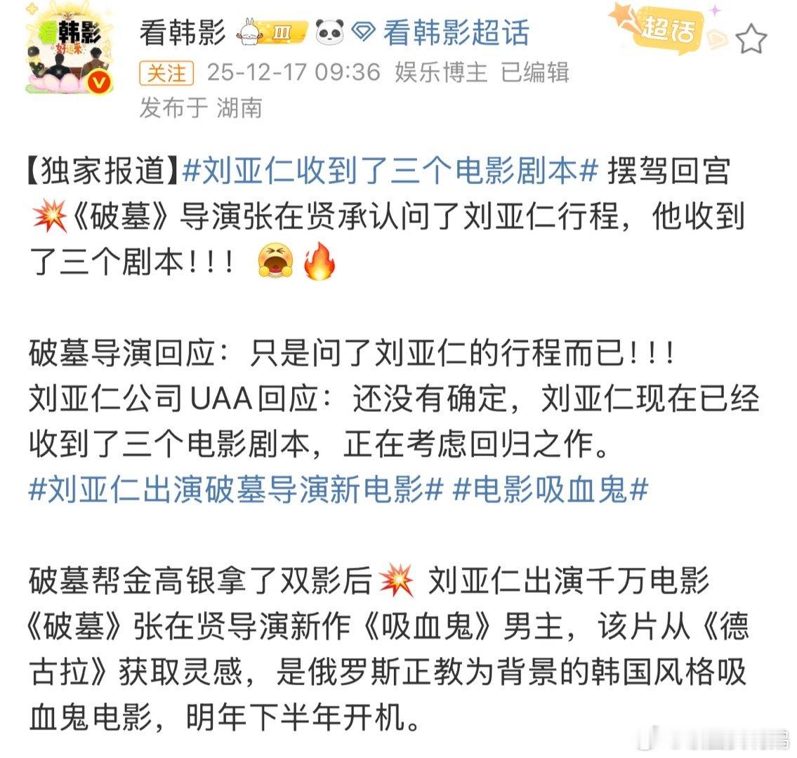 刘亚仁时隔三年出演新电影 曝刘亚仁因吸毒被判刑后……时隔三年复出将出演《破墓》导演新作《吸血鬼》的男主???《破墓》导演回应称:只是询问了有没有合作的意向,但是刘亚仁表示近一年内都不想复出……而且业内表示他已经收到了三个电影剧本,但是他都婉拒了你们hgr真的没界限了居然还能复出…