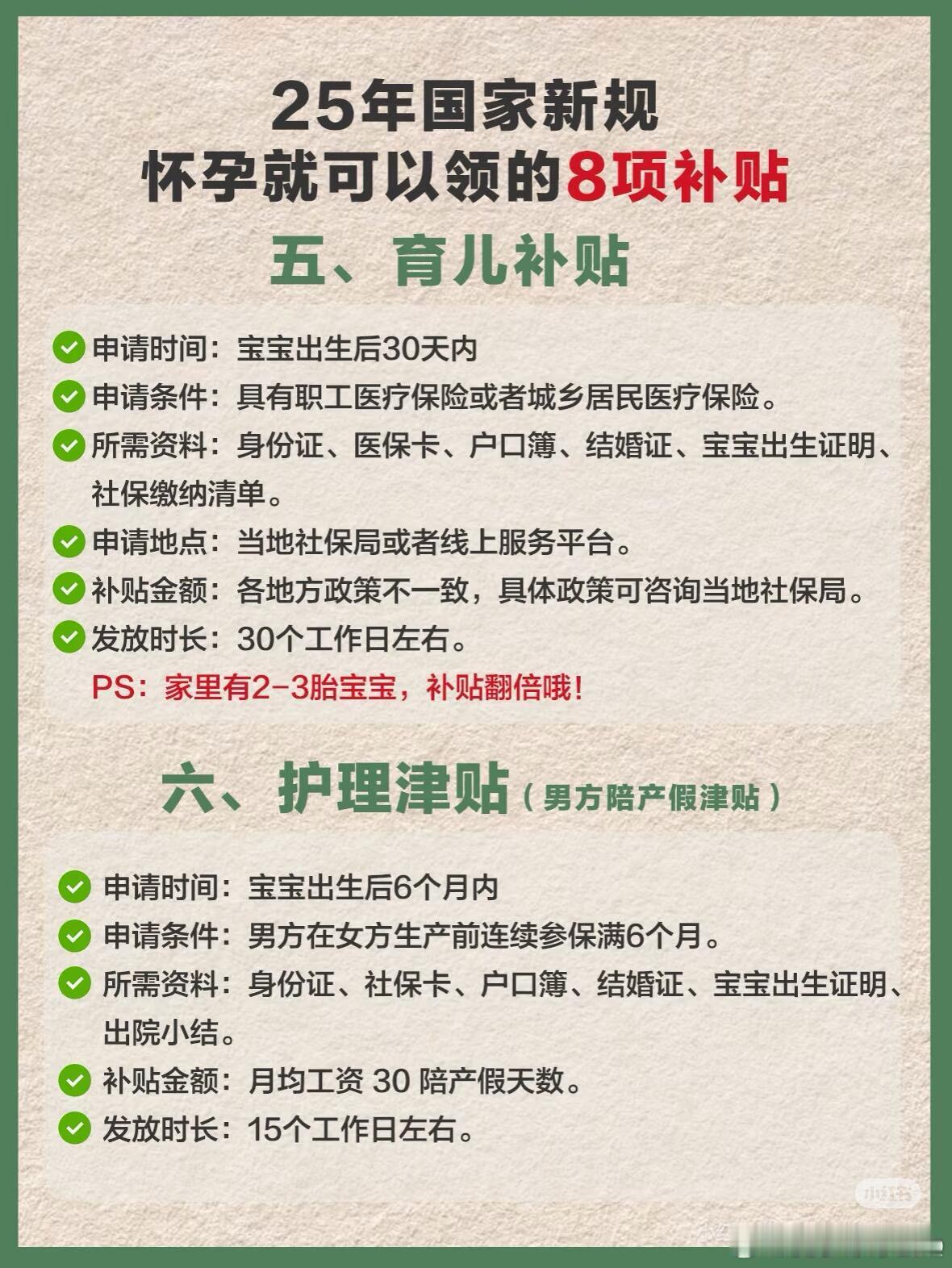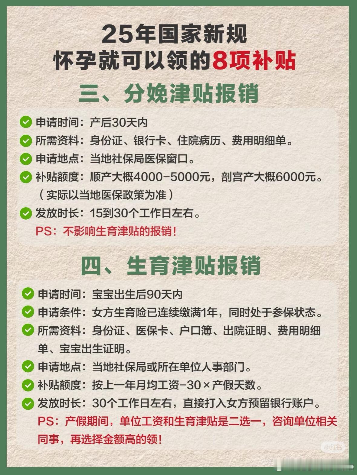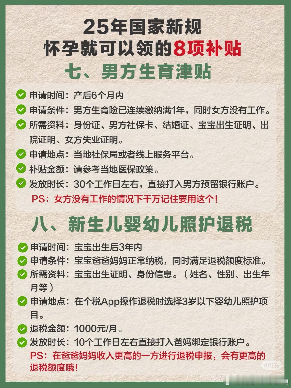 2025年怀孕就可以领的8项补贴,你领了吗?1️⃣产检费用补贴2️⃣生产费用报销3️⃣分娩津贴报销4️⃣生育津贴报销5️⃣育儿补贴6️⃣护理津贴7️⃣男方生育津贴8️⃣新生儿婴幼儿照护退税明年生娃基本不用再花钱