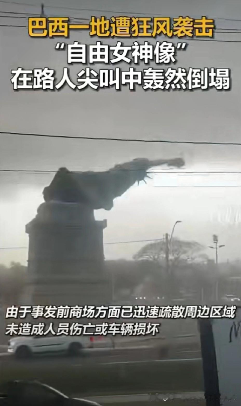 巴西复刻的美国“自由女神像”倒塌了, 原因是因为风太大所致。 不过这兆头可不好啊, 放在以前高低得来一场大祭才能平息得了这样的一个意外。 不过聊以安慰的是, 自由女神直到摔在地上的时候手中的火炬都是高高举起的。[奸笑][奸笑]