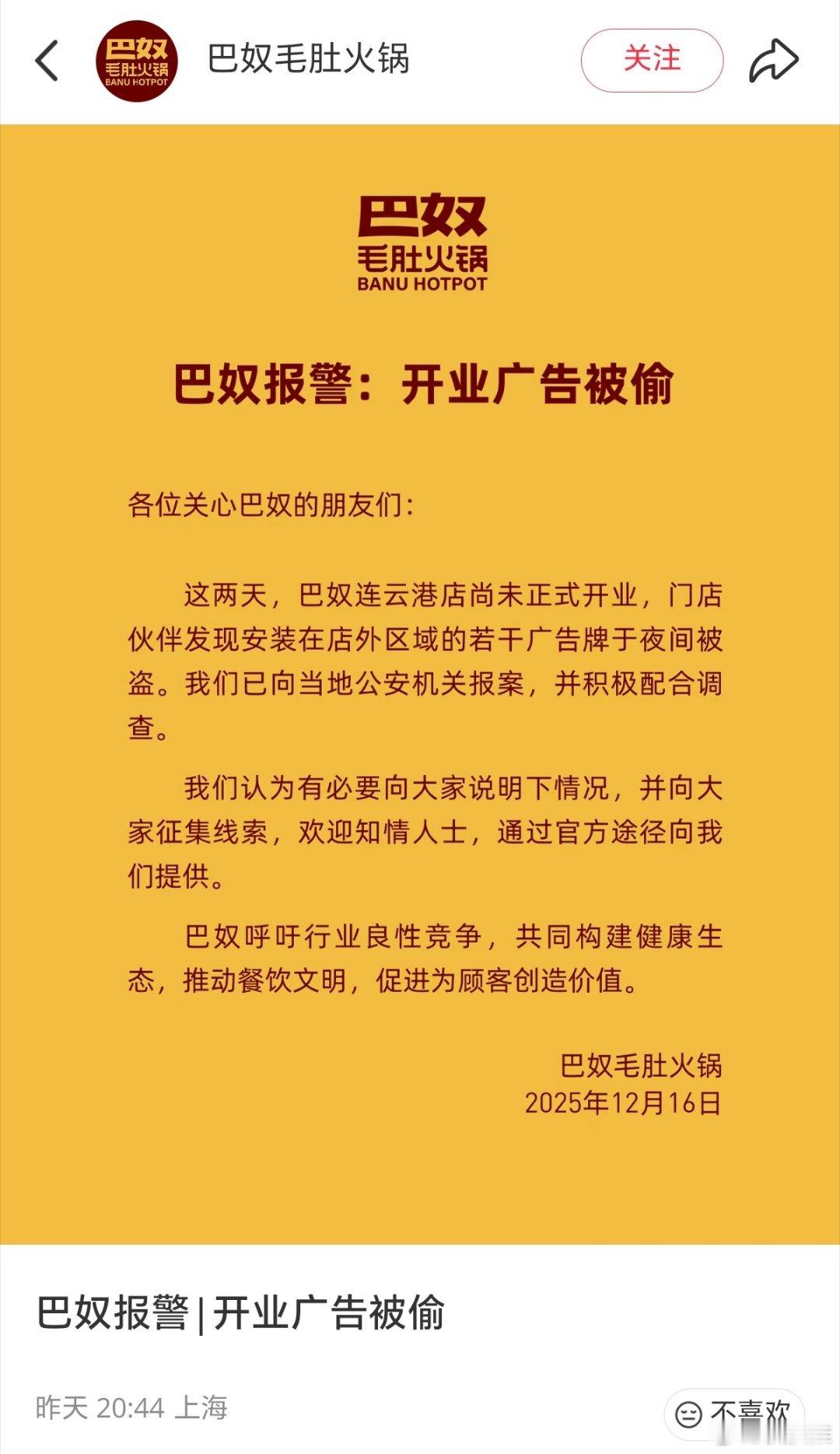 巴奴回应开业广告被偷近日,巴奴火锅连云港店的开业广告牌被偷,随后小编在社交平台发文并已向当地公安机关报案。网友的评论有点意思:我在闲鱼上看到了;最原始的商战,偷走对方广告牌;我以为是玩梗,原来真丢了。科技先锋官