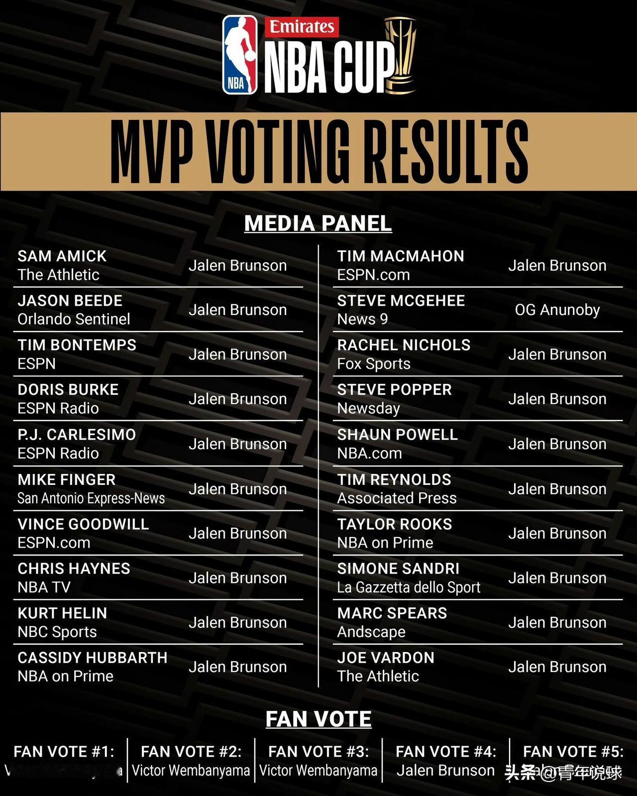 19比1!杯赛MVP投票结果出炉! 今天的NBA杯总决赛,尼克斯队以124-113力克马刺队拿下冠军,每人再收获53万美金奖金。 当家球星布伦森荣膺本届NBA杯MVP,投票结果也已出炉,共计20位媒体记者参与了投票,其中19人选择了布伦森,只有1人选择了阿努诺比。布伦森在淘汰赛期间场均可以得到33.3分6.7助攻,当选MVP当之无愧。1位记者选择阿努诺比的理由也很简单,他在决赛中表现最为出色,全场得到28分9篮板3助攻,尤其在上半场几乎以一己之力扛着球队前进。值得一提的是,NBA杯MVP是看整个杯赛期间的表现来评选,并不是一场论,所以布伦森当选实至名归!