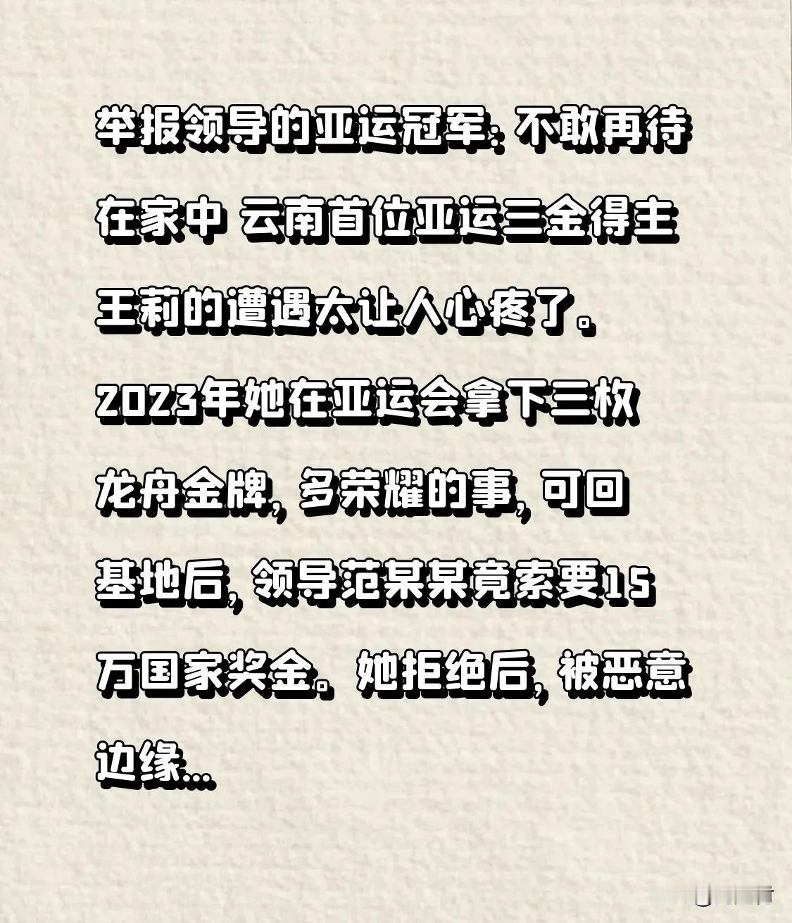 举报领导的亚运冠军:不敢再待在家中 举报领导的亚运冠军:不敢再待在家中 云南首位亚运三金得主王莉的遭遇令人心疼。2023年亚运会,她斩获三枚龙舟金牌,荣耀至极。然而回基地后,领导范某某竟索要15万国家奖金。她拒绝后,被恶意边缘化,无法训练还被逼离开。 长期打压使她患上重度抑郁,实名举报后不敢在家居住,15号晚只能借住朋友空房。她还公布了基地人员与她谈话涉及“下队”等问题的录音。好在多地警方联系保障她的安全。云南省体育局已展开调查,望彻查真相,还王莉公道,让滥用职权者受到惩处。 王莉老师 奥运冠军涉腐